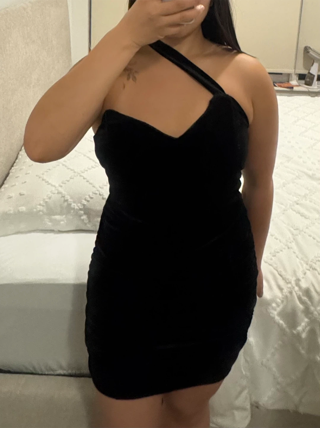 Selling a cute black one-shoulder mini dress. It's a stylish piece perfect for a night out or special occasion. The dress features a flattering silhouette, boning in the bodice, and is made of a soft, velvety material. Only worn once!