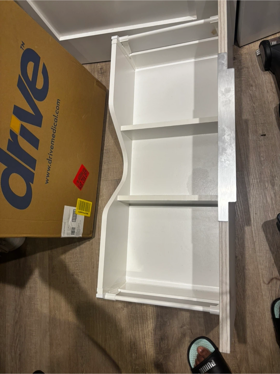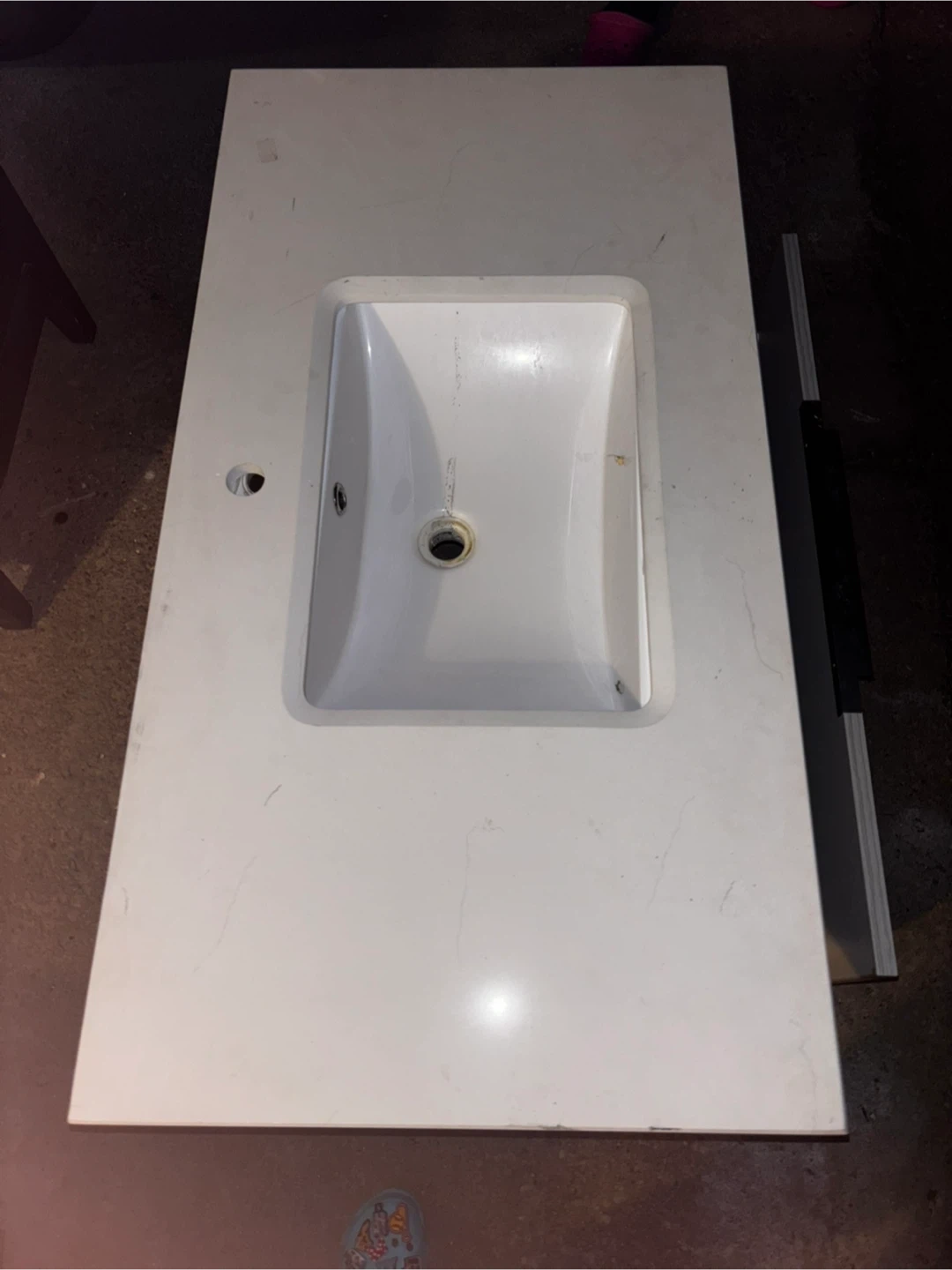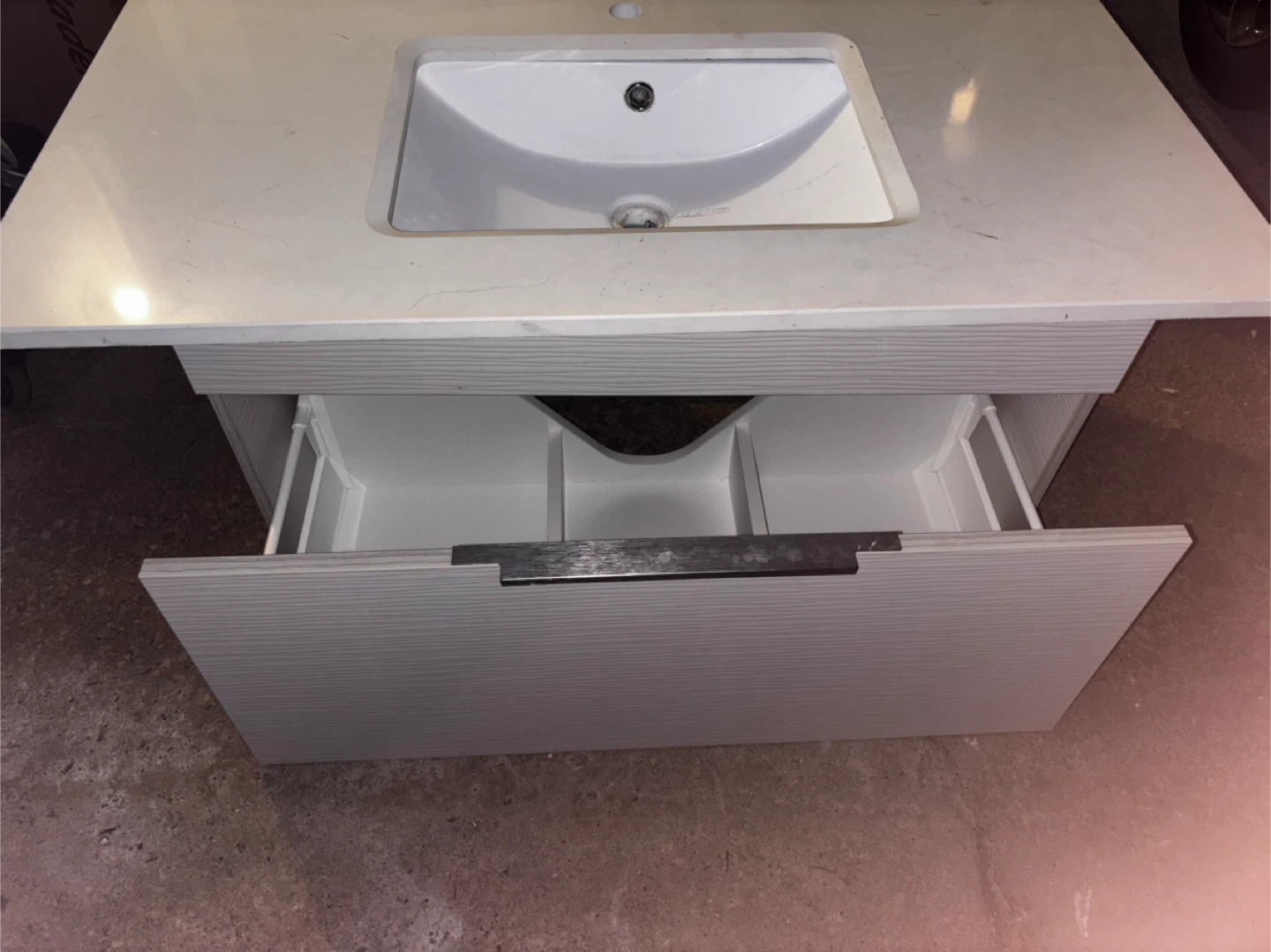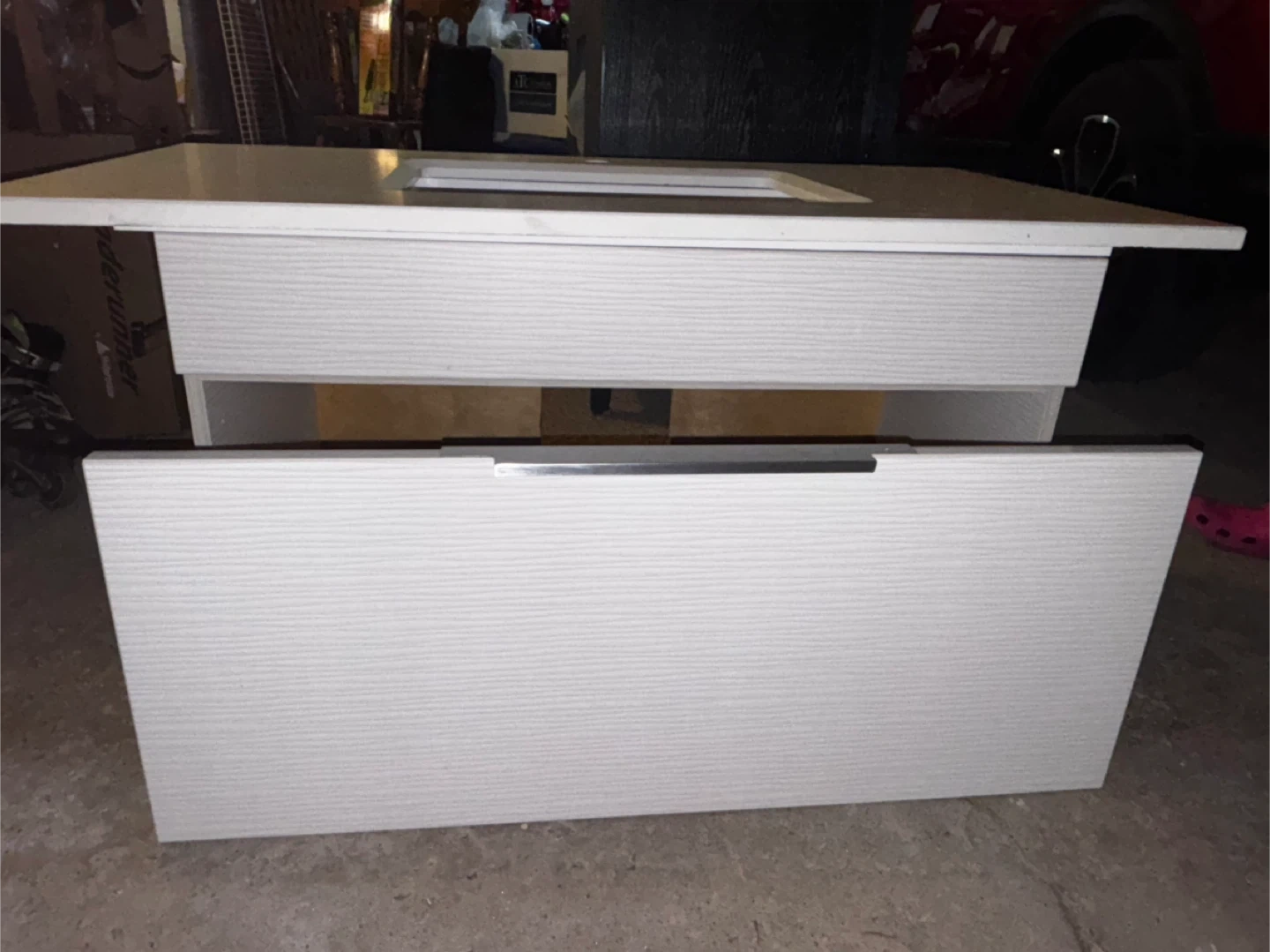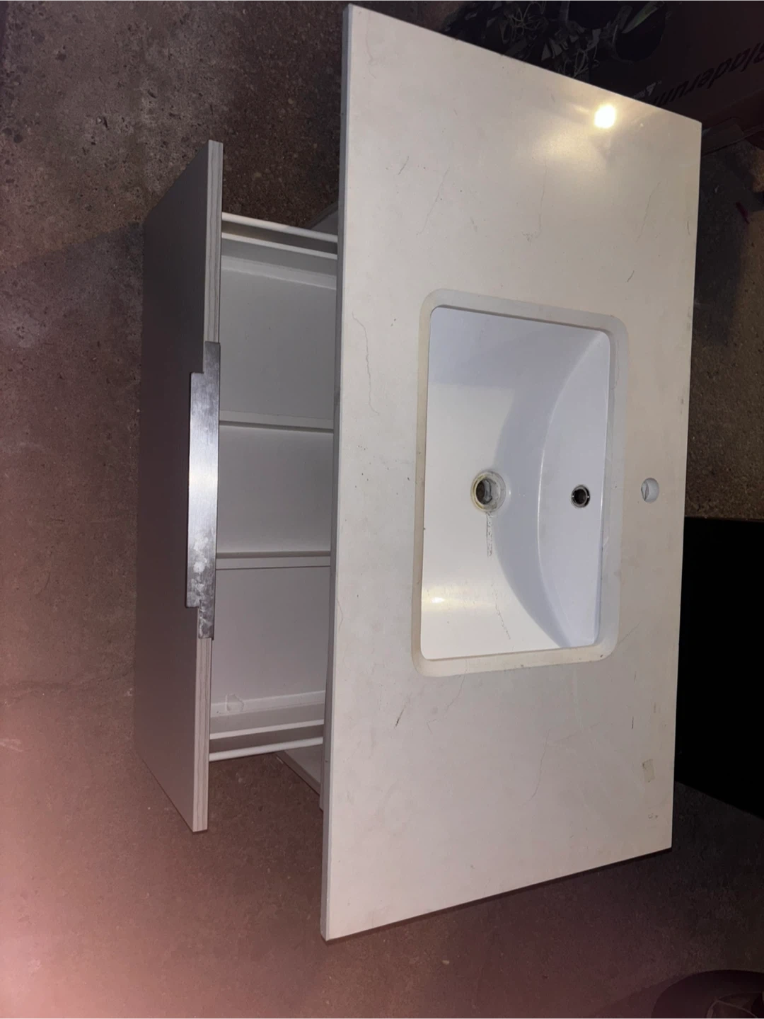 Selling a bathroom vanity with a built-in sink and storage. It features a clean, white finish and a modern design. The vanity includes drawers for convenient storage. Perfect for a bathroom upgrade!