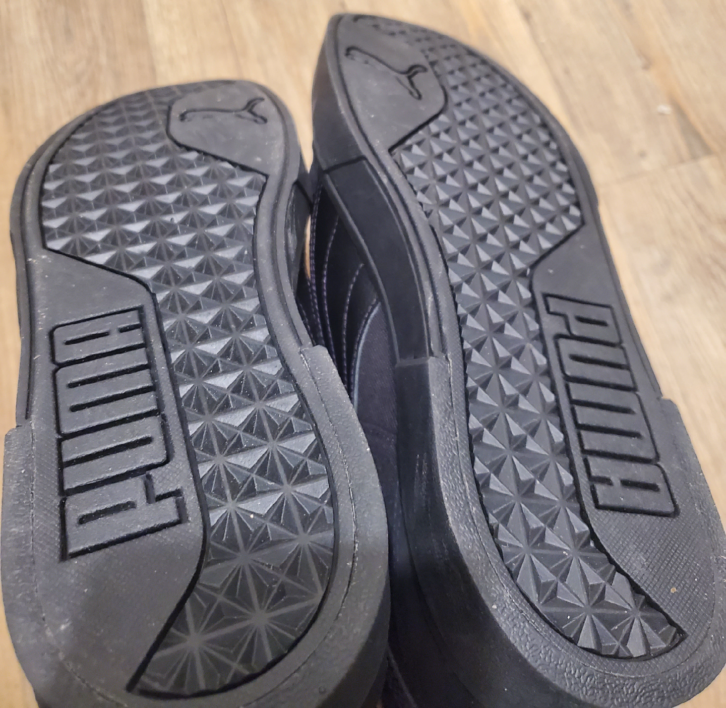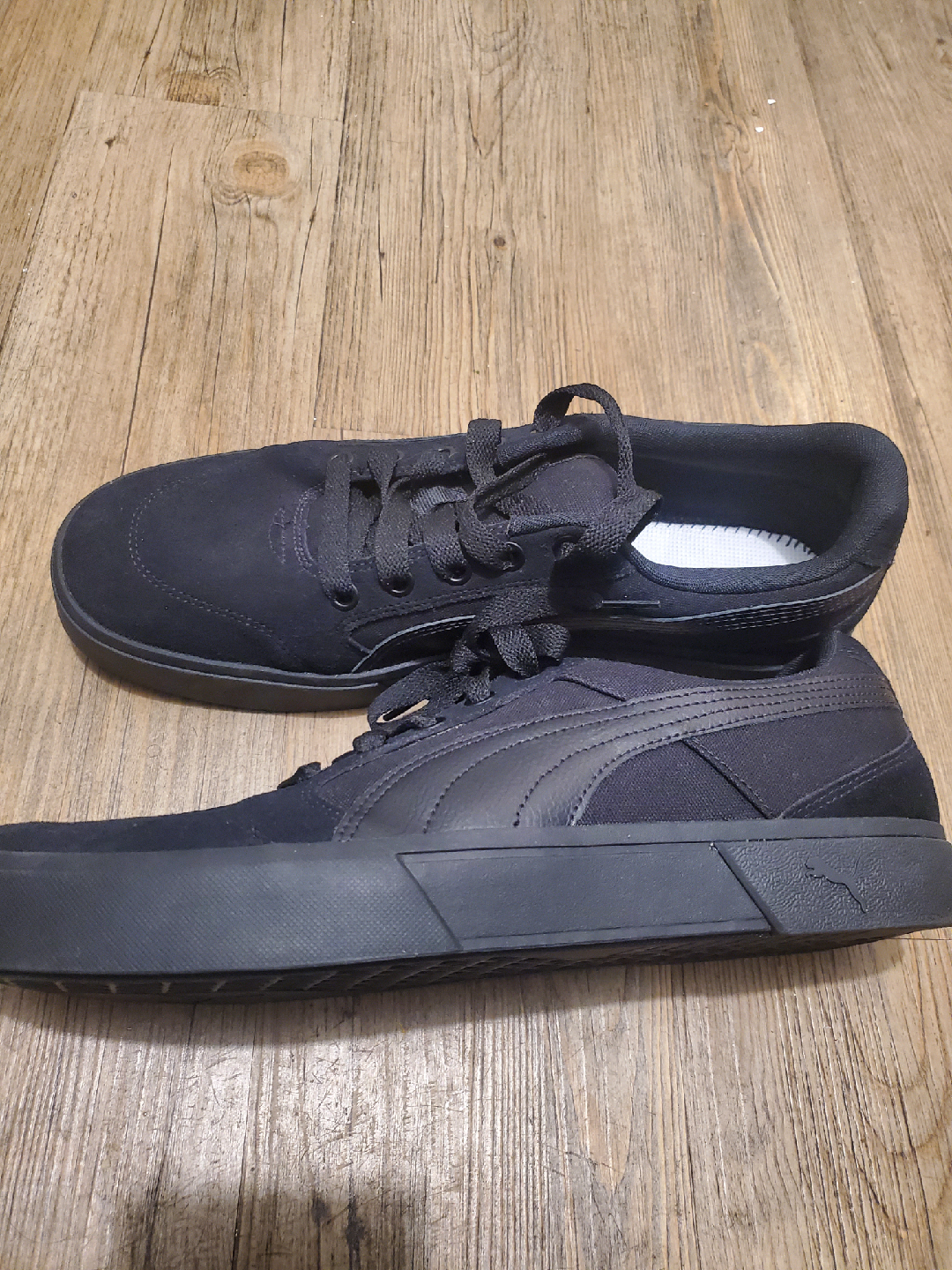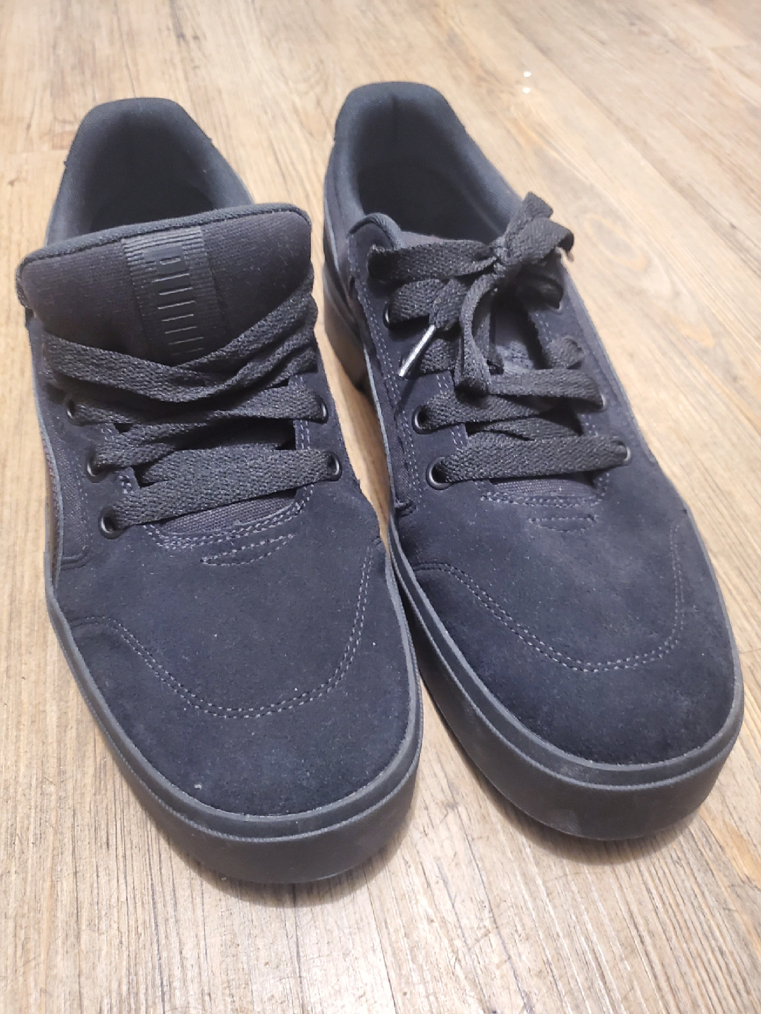 Selling a pair of new Puma sneakers in (suede? soft material) black. Worn about twice just to try on and once outdoors. They're in great shape. Good for you to rock with casual wear or skate in them, the choose is yours!. The size is US 14, all black with the thick laces & insoles taken out; swapped.