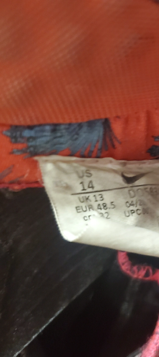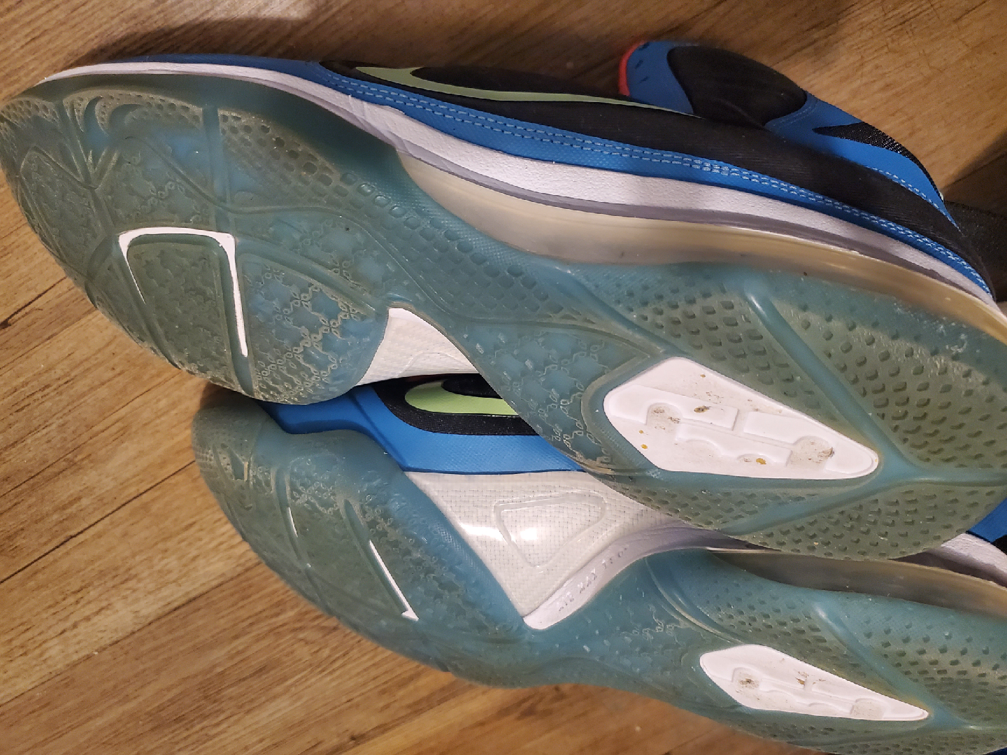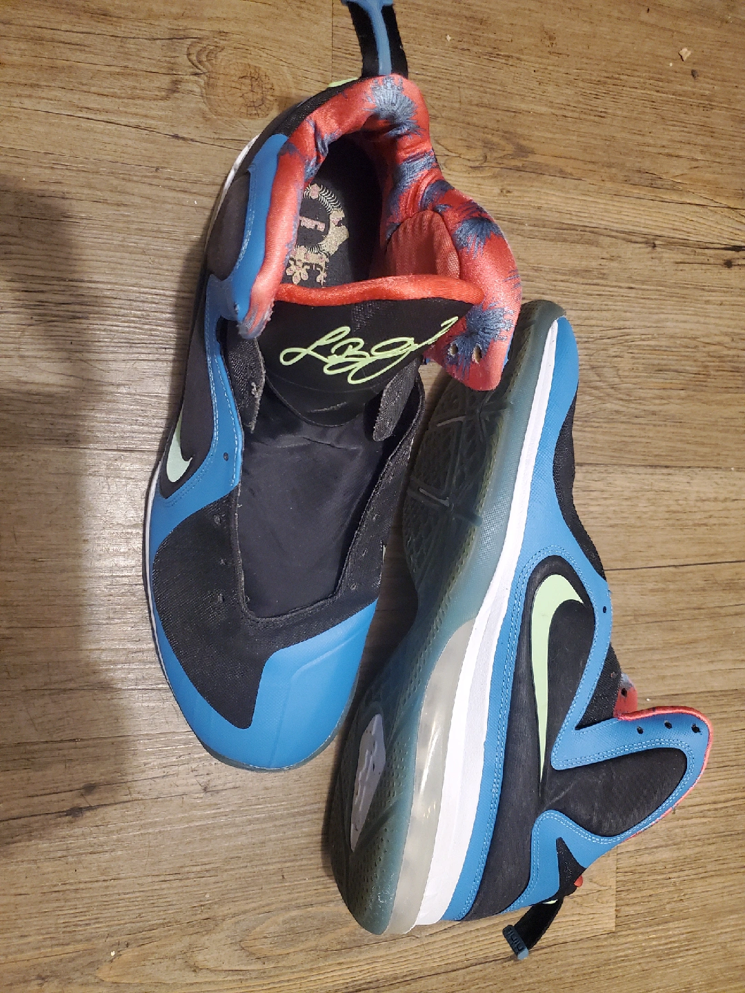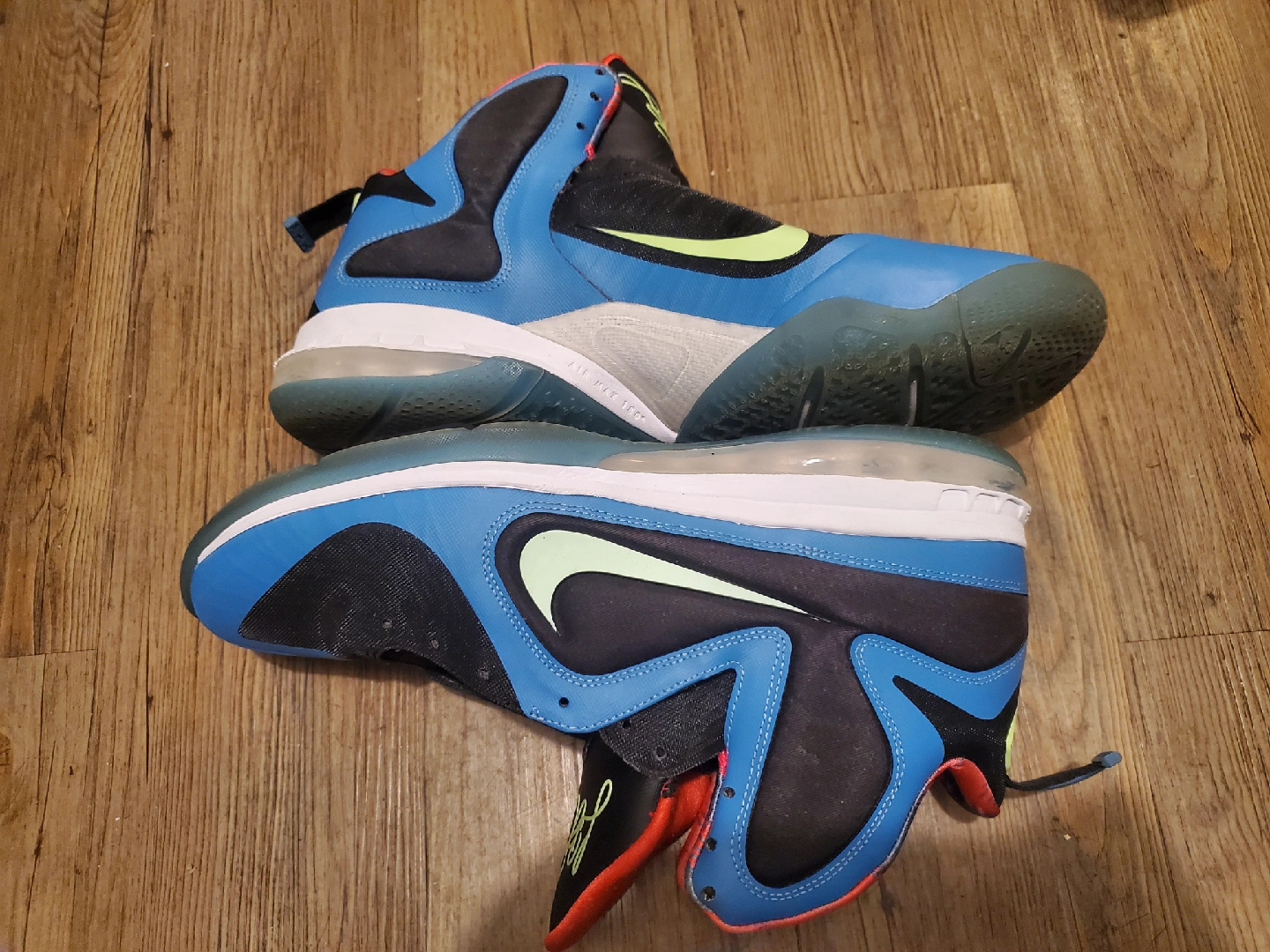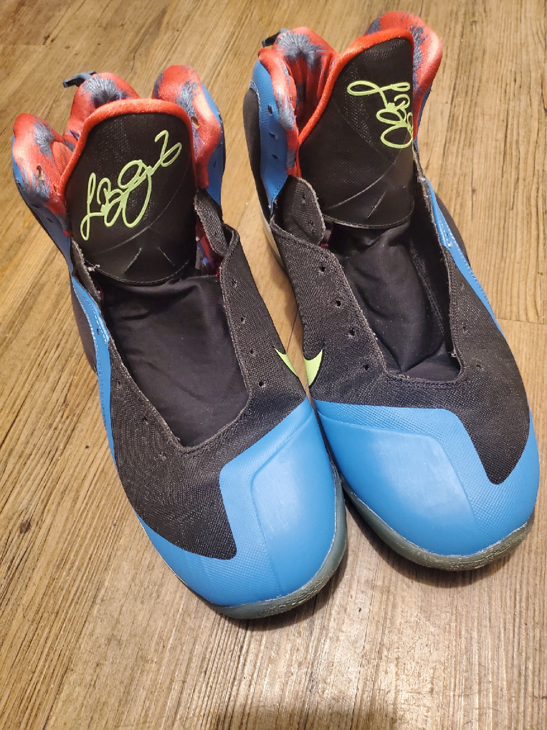 Selling a pair of Nike LeBron 11 basketball shoes in size US 14. They feature a blue, black, and red colour scheme with the LeBron logo. The shoes show signs of wear, especially on the soles, but are still in usable condition for casual wear or basketball. LBJ shoes laces available, just taken out.