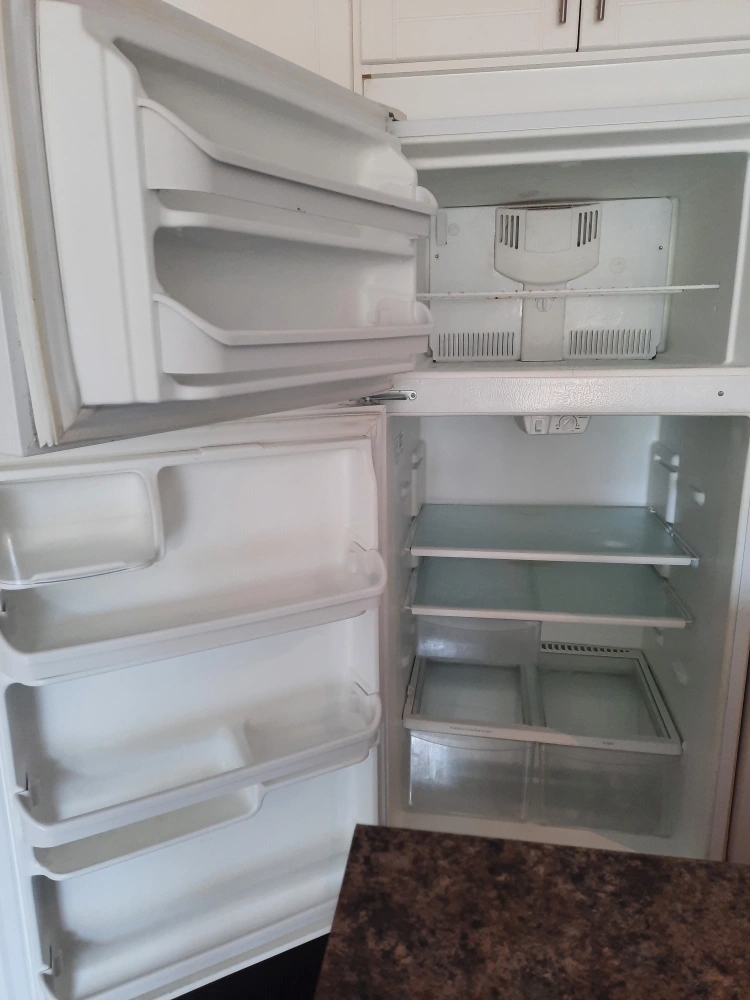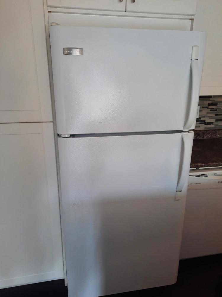 Selling a white Frigidaire top-freezer refrigerator. It's in good working condition and ready for a new home. Perfect for a small kitchen or as a second fridge in the garage. The interior is clean and well-maintained.