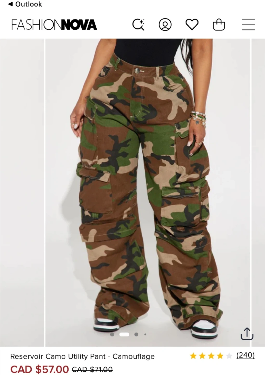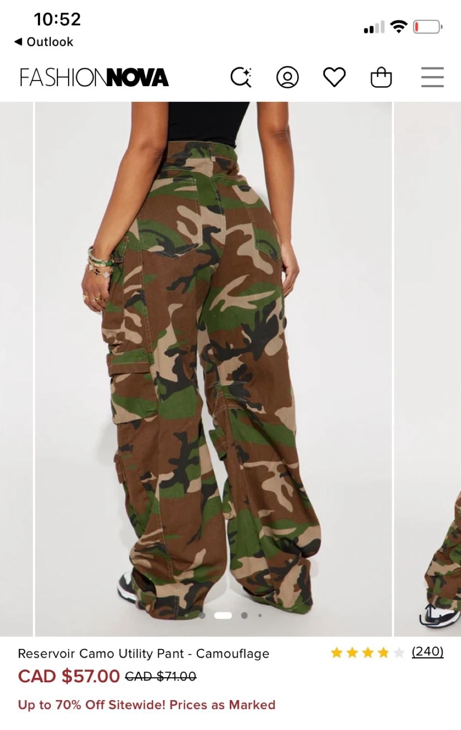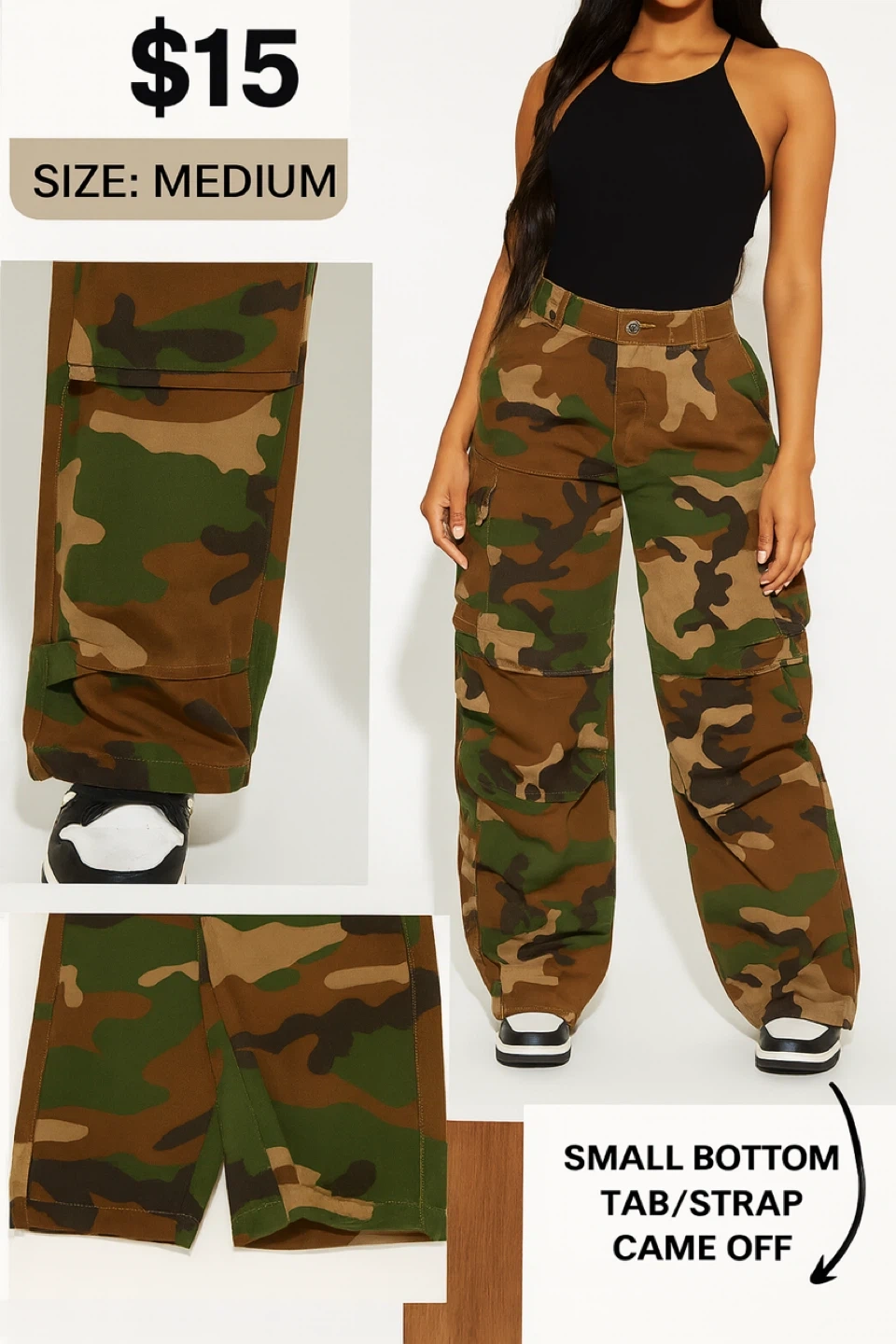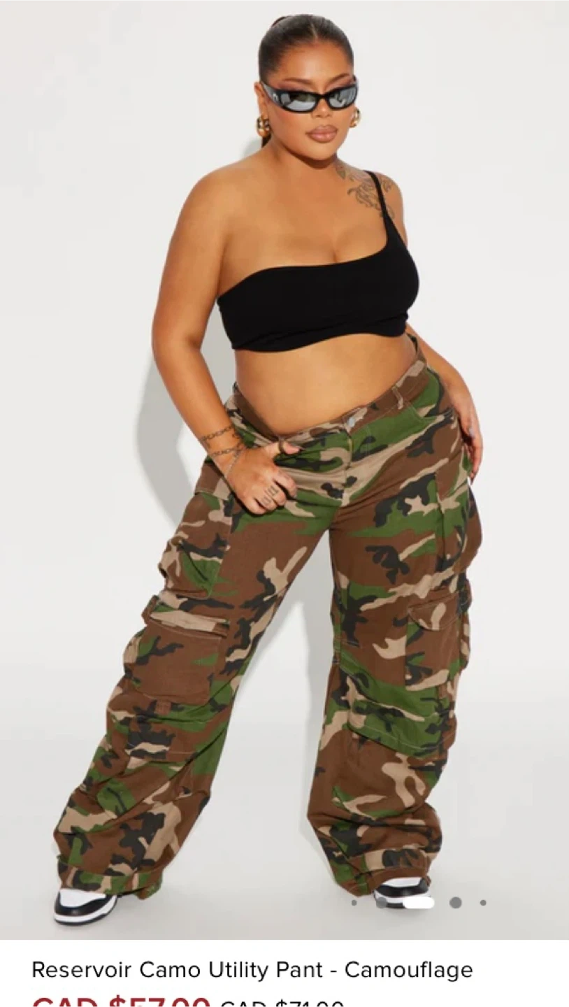 88New with tag Selling a pair of Fashion Nova Reservoir Camo Utility Pants in size medium. The pants feature a cool camouflage pattern and a relaxed fit. Originally bought for $57 CAD. Please note that a small bottom tab/strap came off.