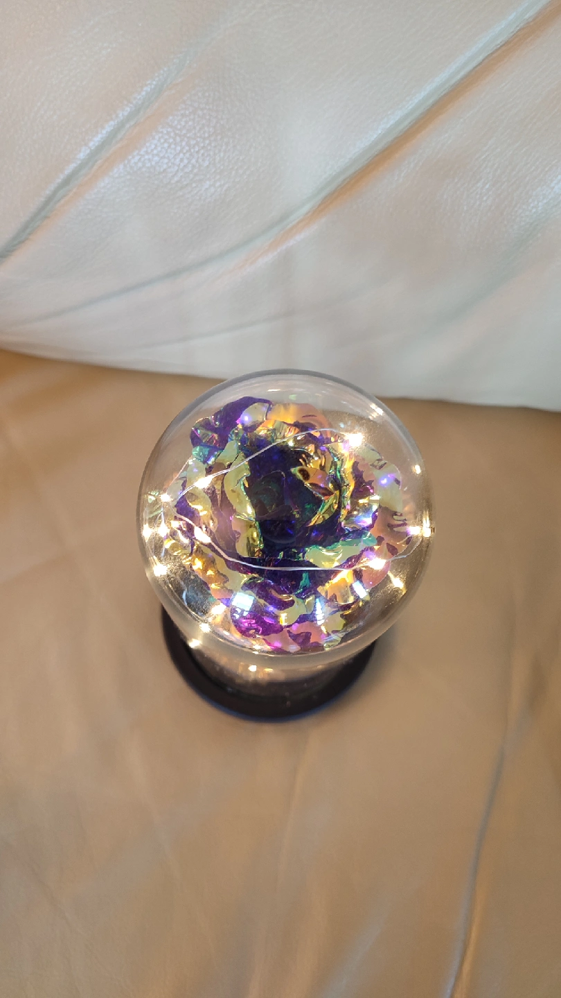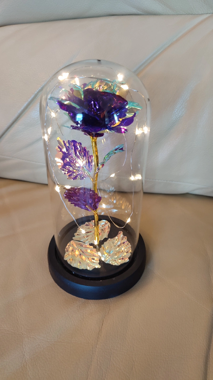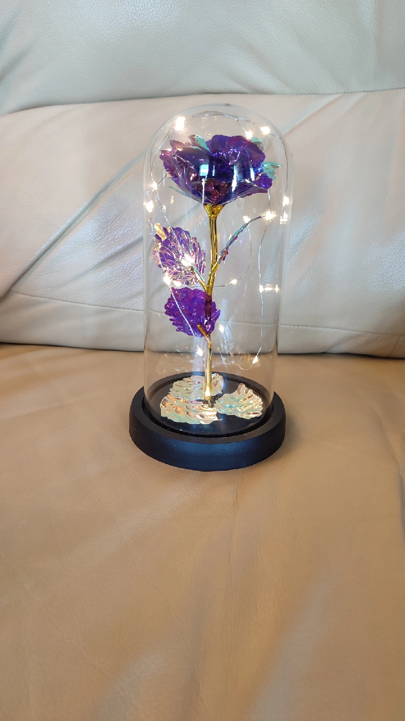 Add a touch of magic to your space with this beautiful enchanted rose flower lamp! The purple rose is encased in a glass dome with fairy lights, creating a warm and inviting glow. It's perfect as a night light or a decorative piece for any room