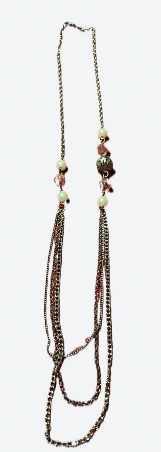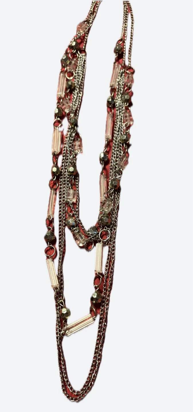 A beautiful necklace featuring a layered design with beads and silver-toned chains. Perfect for adding a touch of elegance to any outfit!