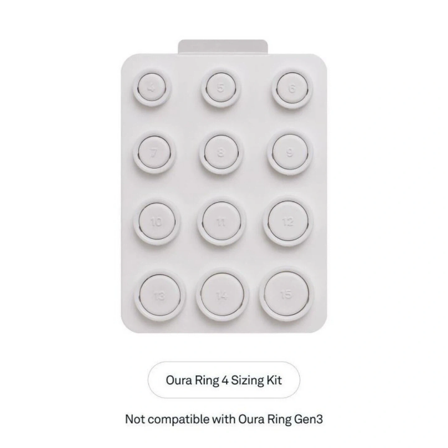 Oura Ring 4 Sizing Kit. It's a handy way to find your perfect fit before investing in an Oura Ring! The kit includes multiple sizes so you can wear them for 24 hours to ensure a snug, comfortable fit. This kit is not compatible with Oura Ring Gen3