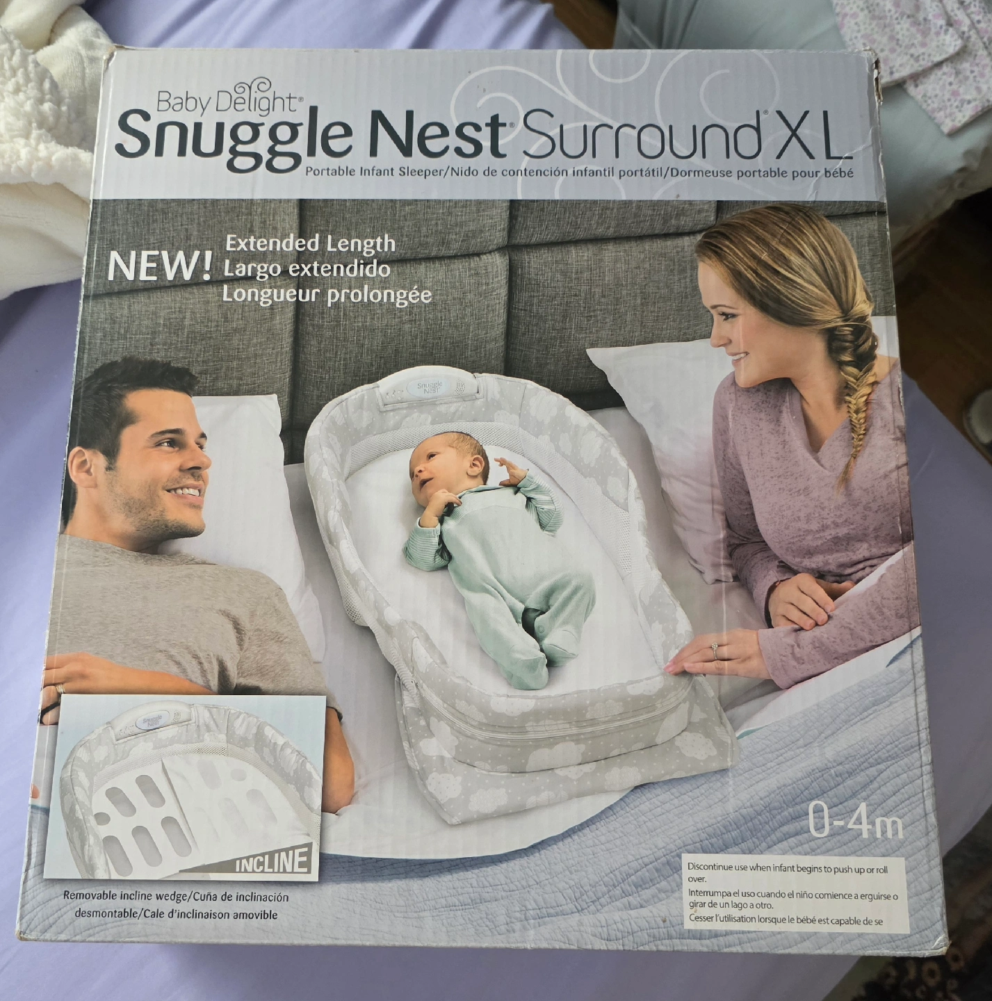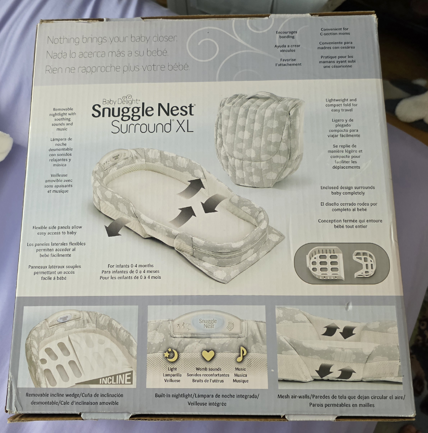 Baby Delight Snuggle Nest Surround XL! It's an extended length portable infant sleeper, perfect for newborns up to 4 months (0-6m). It features removable incline wedges and a built-in nightlight with soothing sounds and music. It's lightweight and compact for easy travel. The enclosed design surrounds baby completely