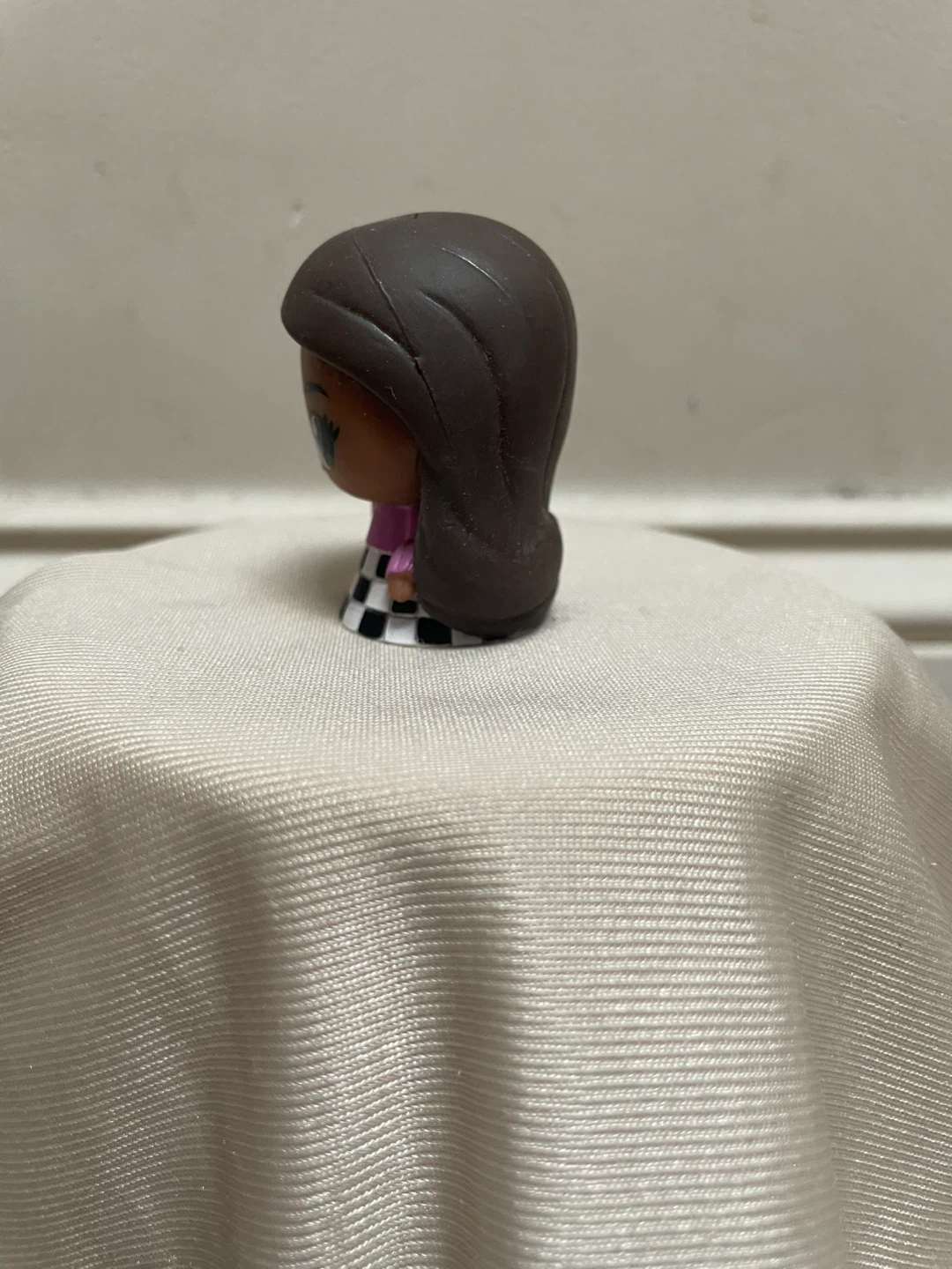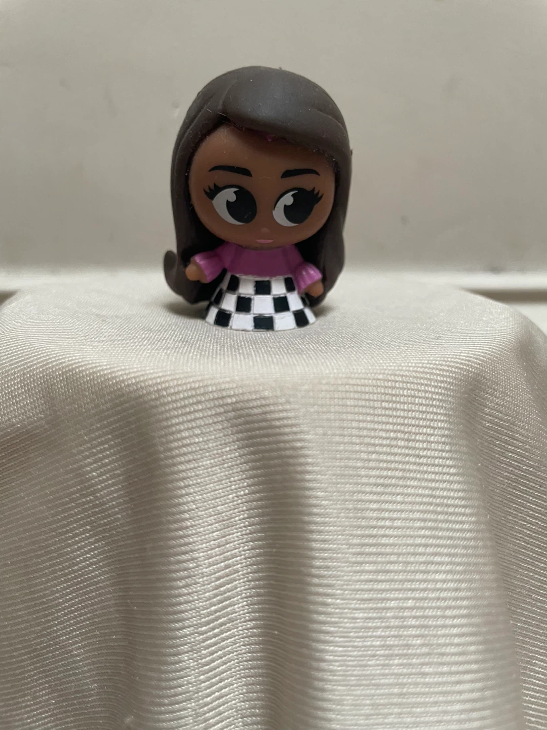Barbie Fashionistas Mash'em, a collectible, squishy toy. It features a brown-haired doll with a checkered skirt and pink top. Great addition to any collection!