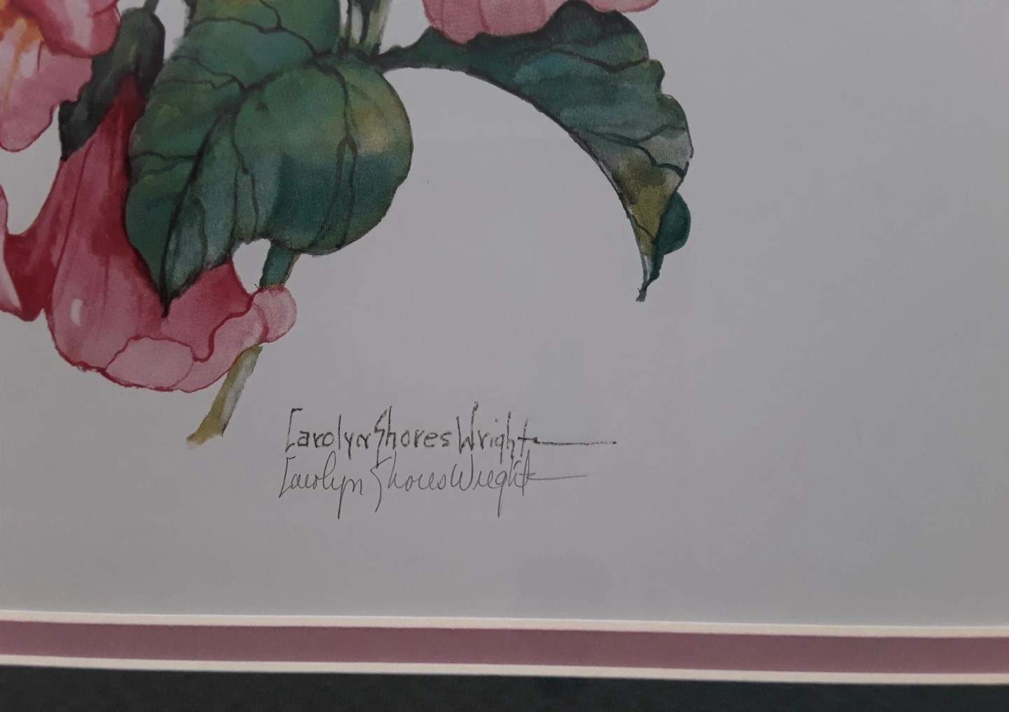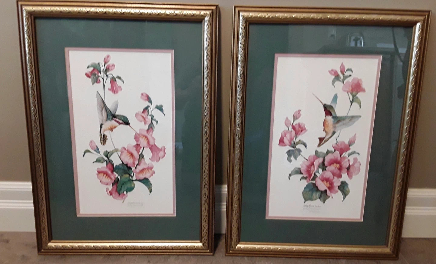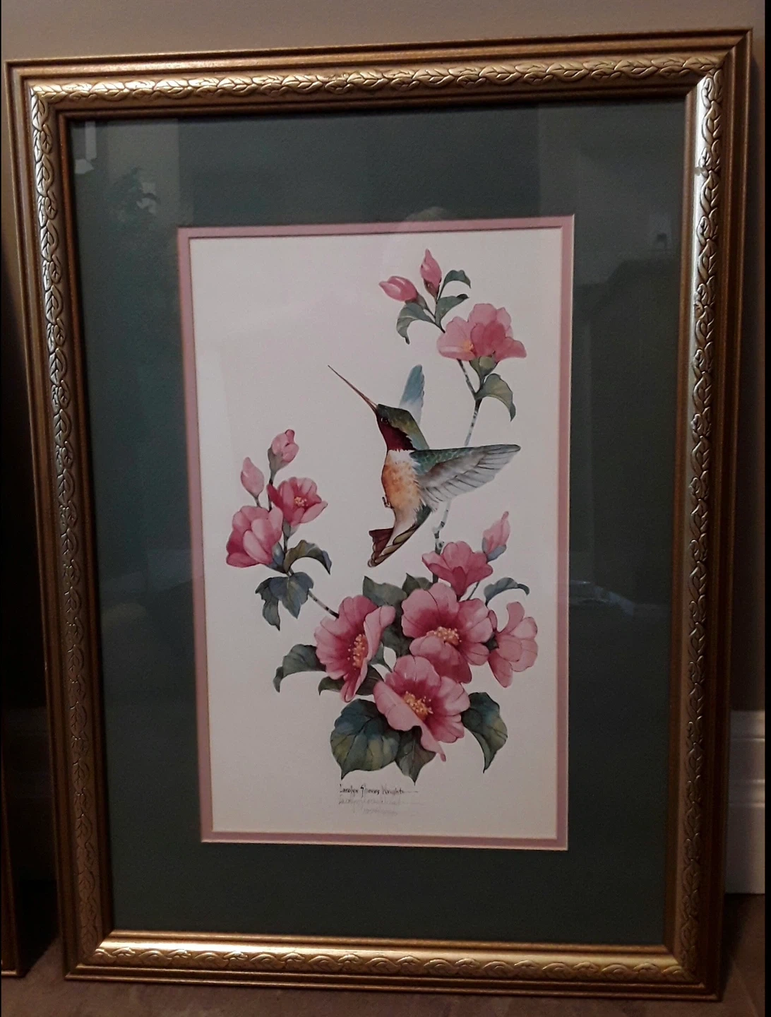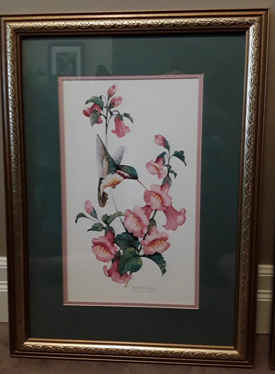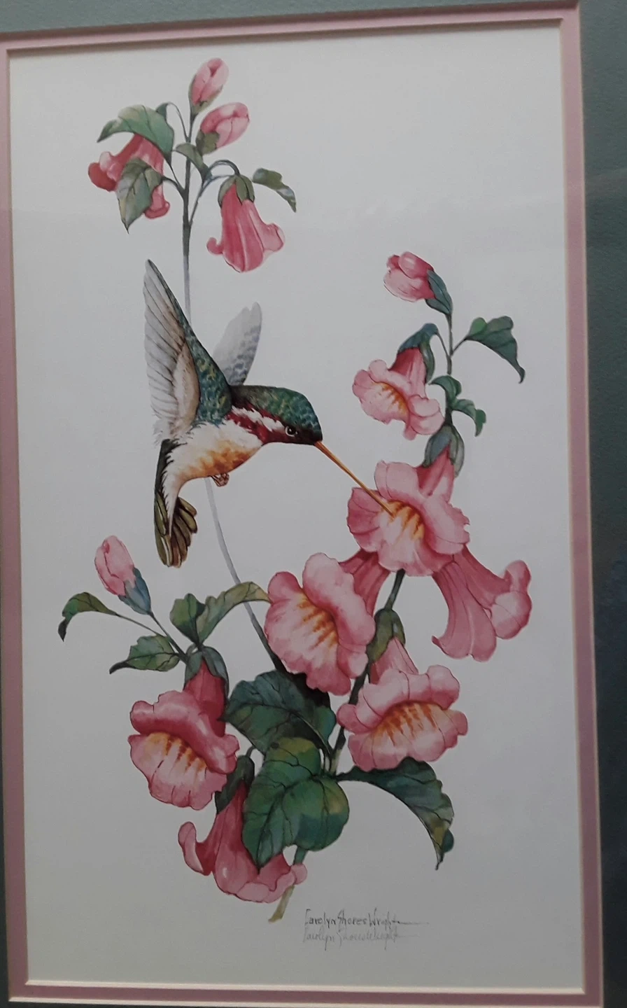 Framed print of a hummingbird and pink flowers by Carolyn Shores Wright. Beautiful addition to any room! $60.00 for both prints