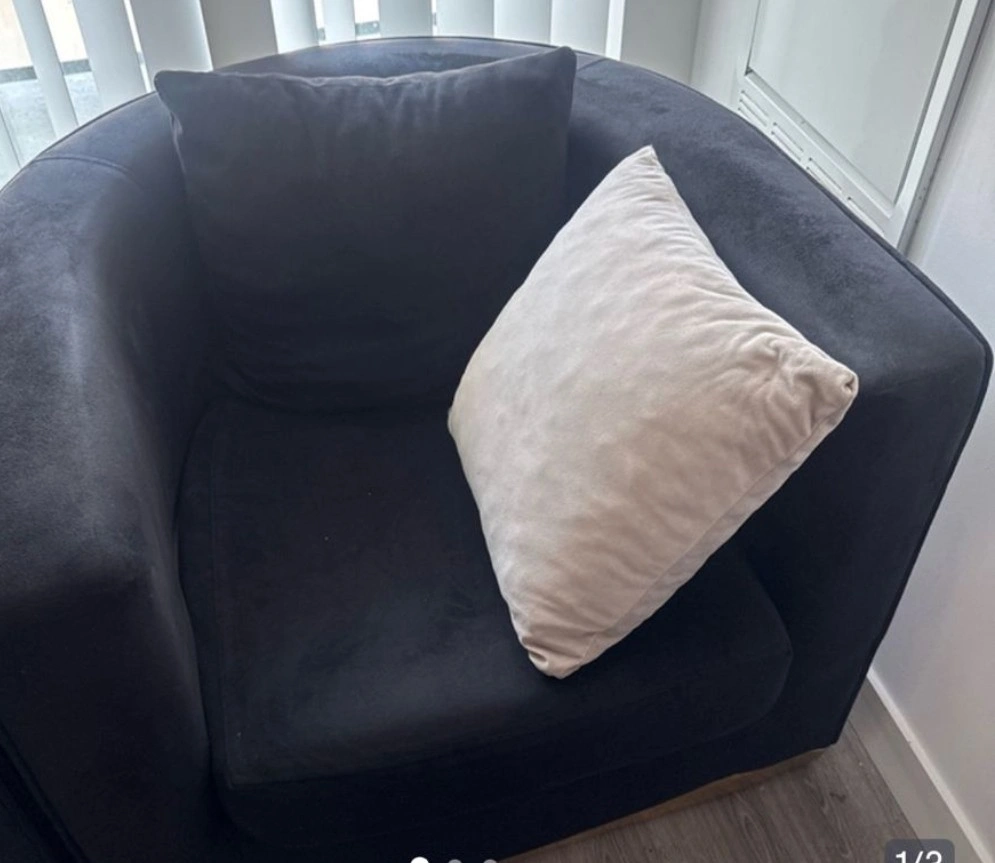 Selling a cozy black armchair! It comes with a soft cushion for extra comfort. The chair is in great condition and would be perfect for a reading nook or living room