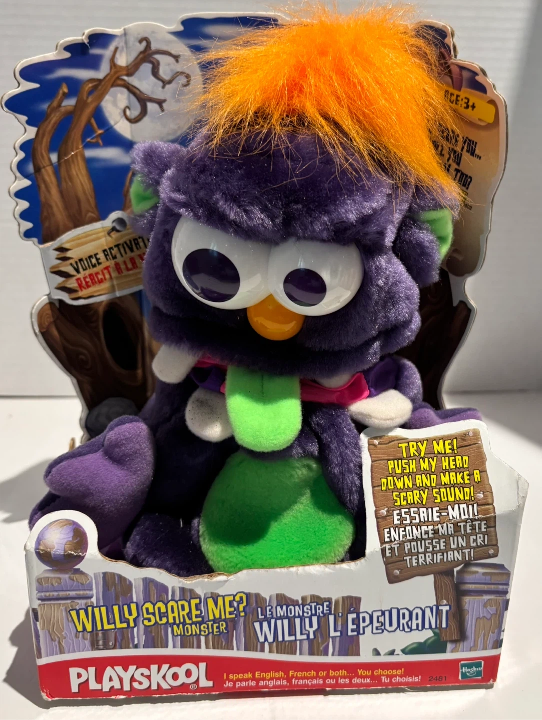 Selling a Playskool Willy Scare Me Monster toy! This furry, fast-talking friend loves a good scare. When you push his head down, he shakes, speaks and makes a scary sound. It says over 20 phrases! It also has voice activity. Requires 3 AA batteries (not included) for battery replacement.