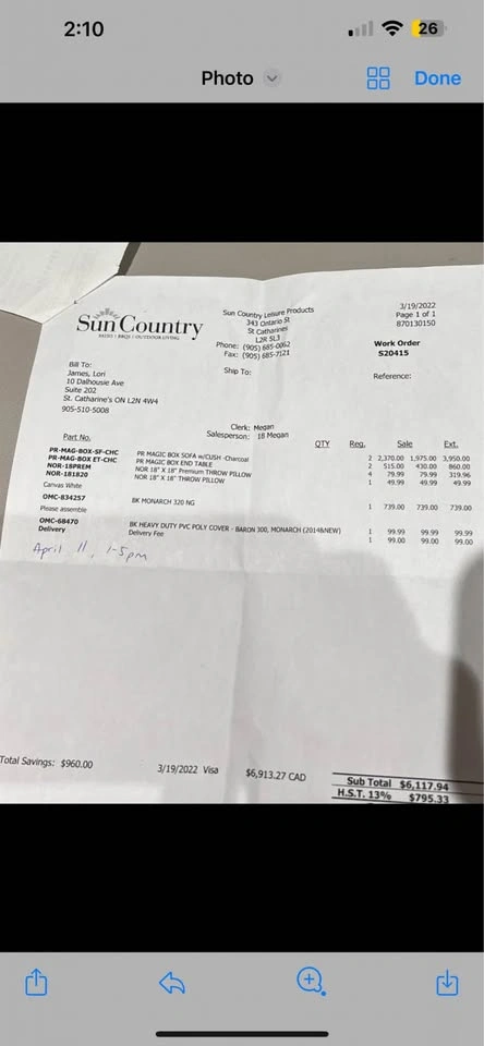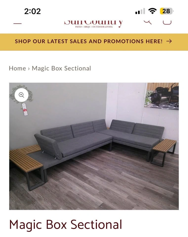 Patio furniture, magic box sectional, nearly brand new! Enjoy this lovely gray sectional, comes with 2 wooden end tables and a cover. Purchased for over $6000 from Sun Country.