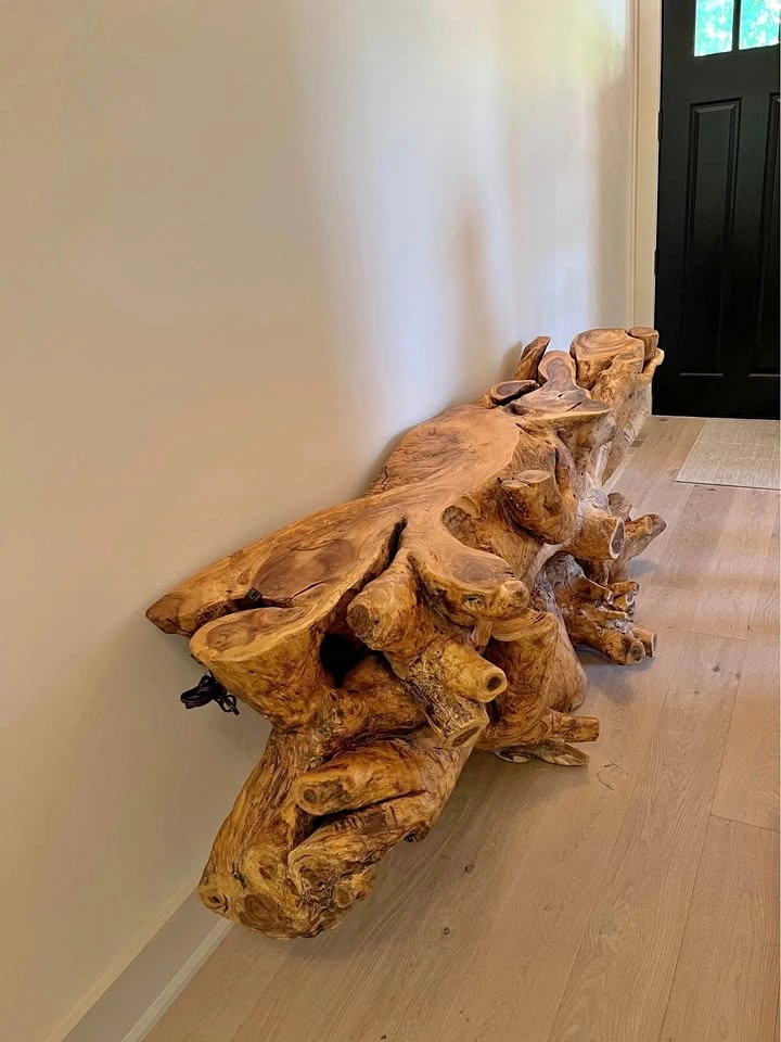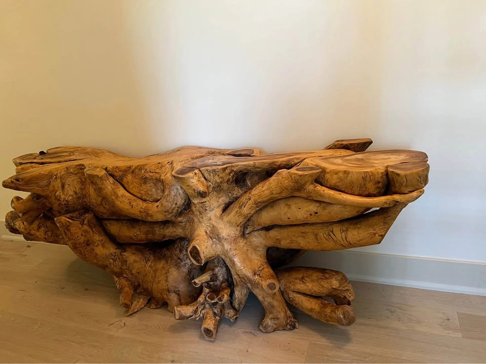 This massive and elegant piece is truly a statement table. Handcrafted from a single teak wood root, it’s both rustic and refined. 📏 Dimensions: • Length: 8 ft • Depth: 3 ft • Width: 2.5 ft ✨ Features: • Rare teak wood root construction • Unique natural design – no two pieces are alike • Strong, durable, and built to last • Makes a stunning centerpiece for any space Perfect for a dining room, statement entryway, or as a conversation piece in a commercial space.