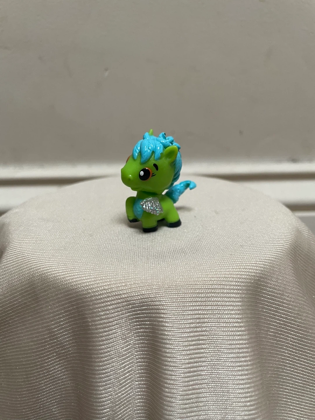 Cute little Hatchimals Colleggtibles pony figure! It's green with a blue mane and tail, and silver wings. Perfect for any Hatchimals fan