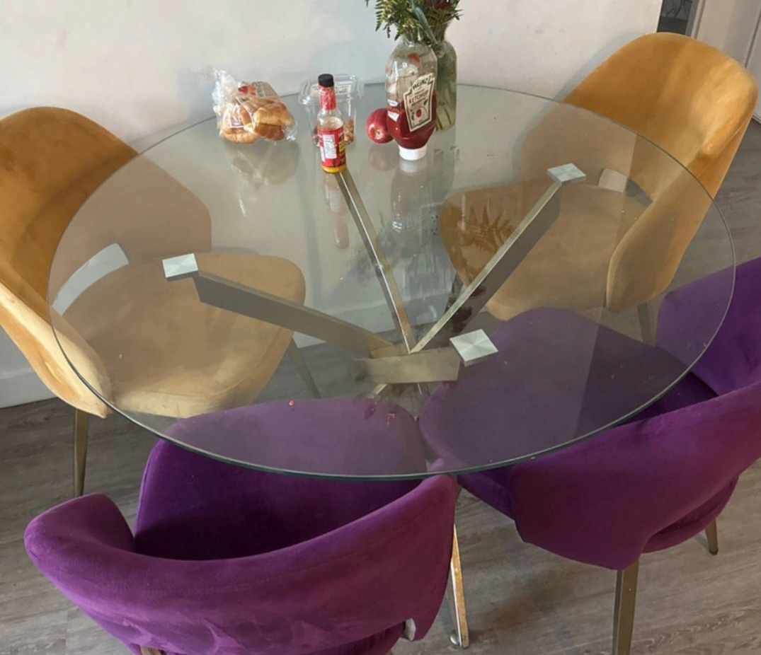 Selling a stylish glass round dining table, perfect for a modern dining room! It comes with four chairs, two in a lovely mustard yellow and two in a vibrant purple. The table features a unique geometric metal base. Great for small spaces or adding a pop of colour to your home!