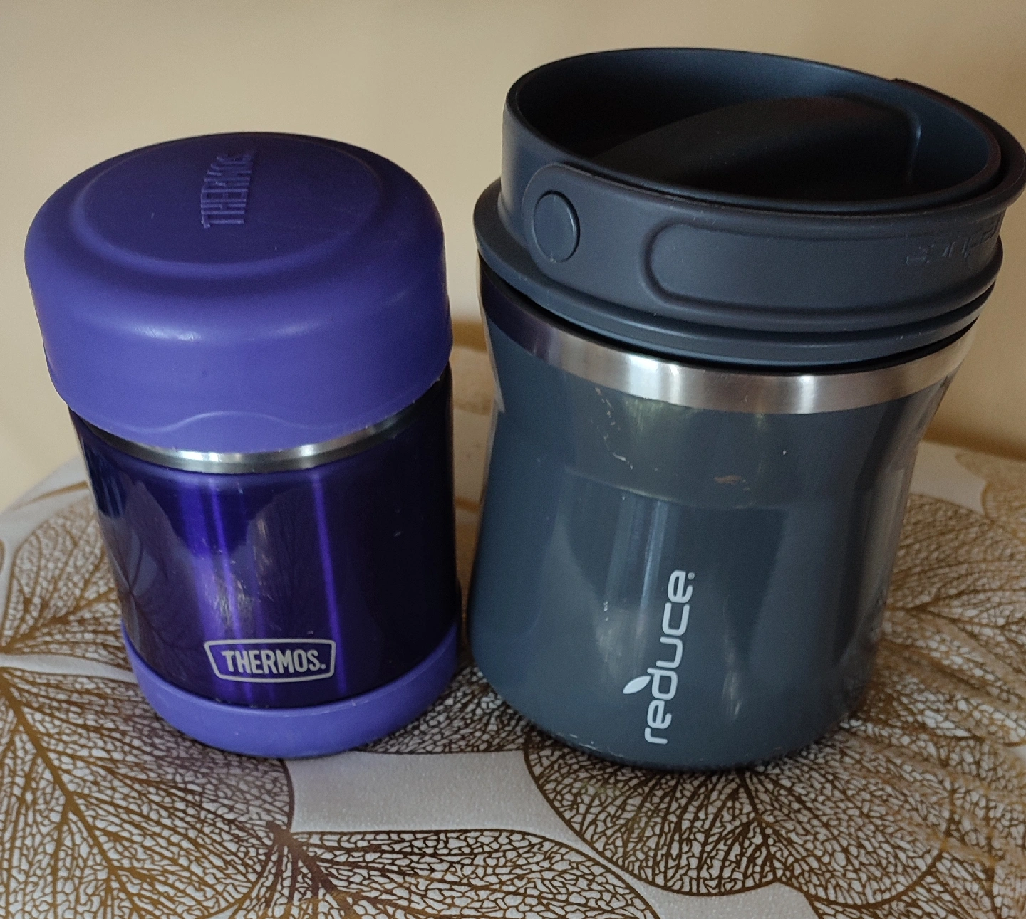 Selling a used Thermos and food container to keep your food warm on the go. The Thermos is purple, and the container is grey. wear and tear on the outside but both still work and are clean.