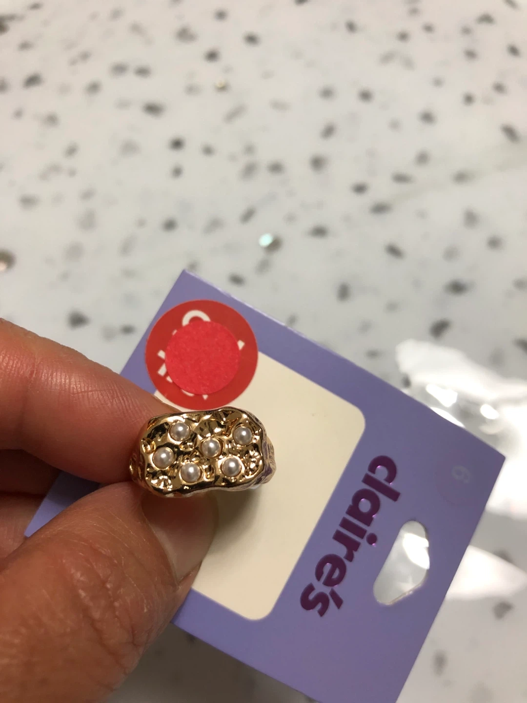 Selling a Claire's ring in a size 6! It's a gold colour with pearl details. Perfect for adding a bit of sparkle to your outfit!