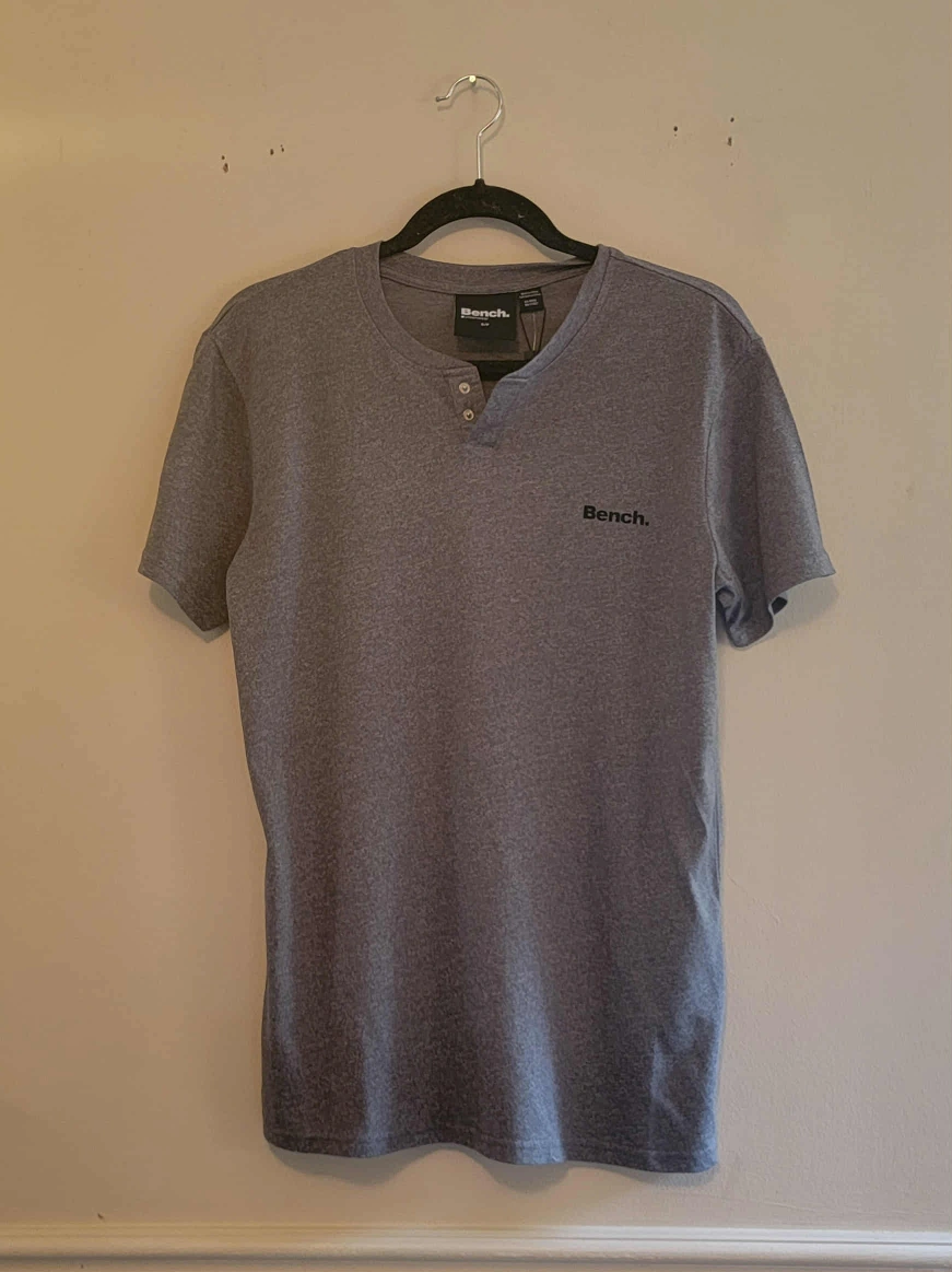 This Grey and Black Bench Men's T-Shirt is Brand New and never worn. Tags attached. Size S 50% Cotton 50% Polyester Has Functional Buttons. Measurements: Pit to Pit: 21 inches. Length: 27 inches. From a smoke free home. Cash and E-Transfer accepted. Pick up only.