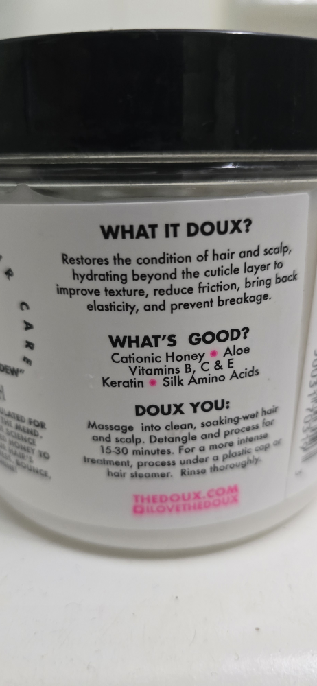 contains Cationic Honey, Aloe, Vitamins B, C & E, Keratin, and Silk Amino Acids.
