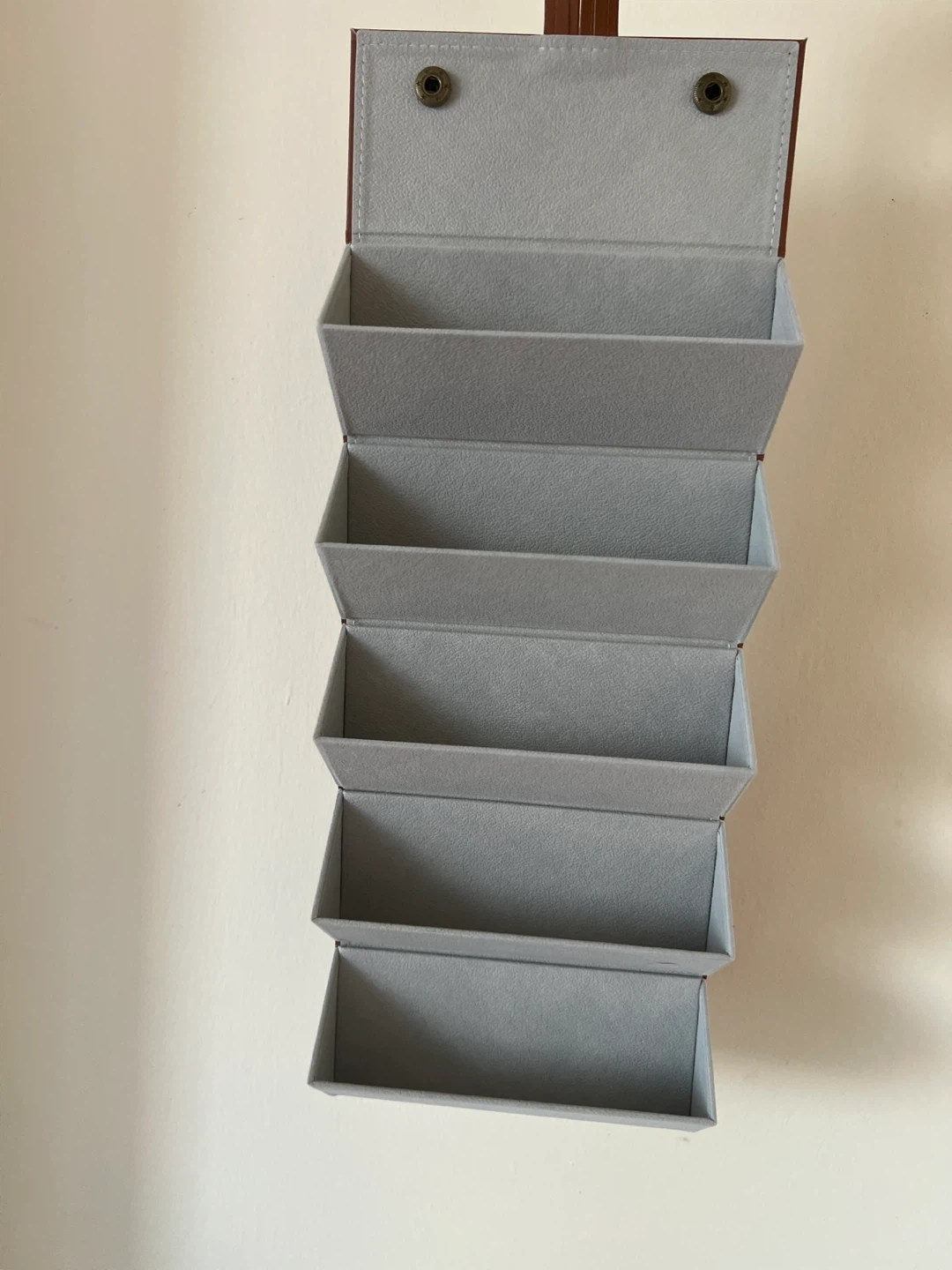 It's a great way to save space and protect your glasses from scratches. The organizer features a brown exterior and a soft grey interior lining.