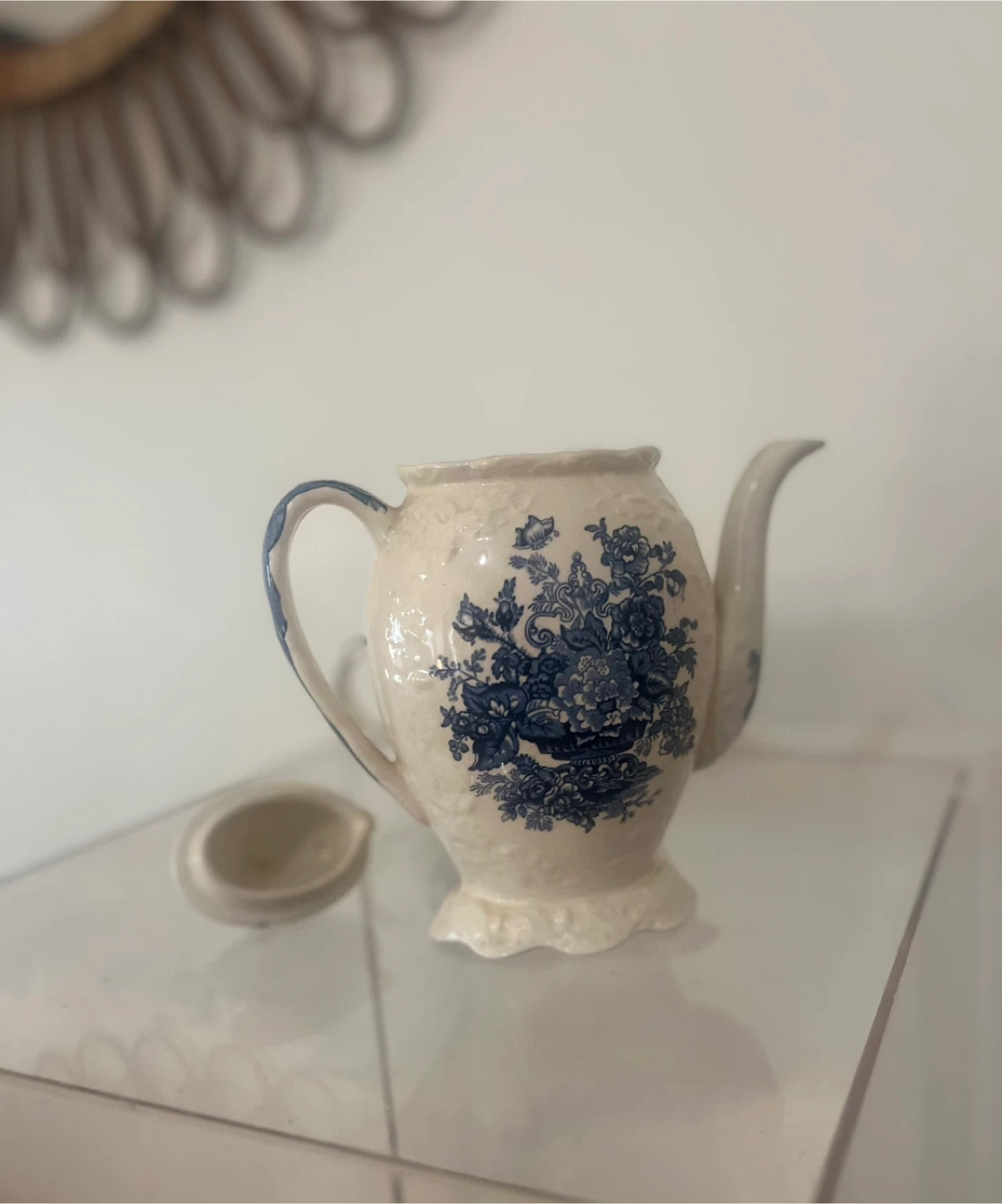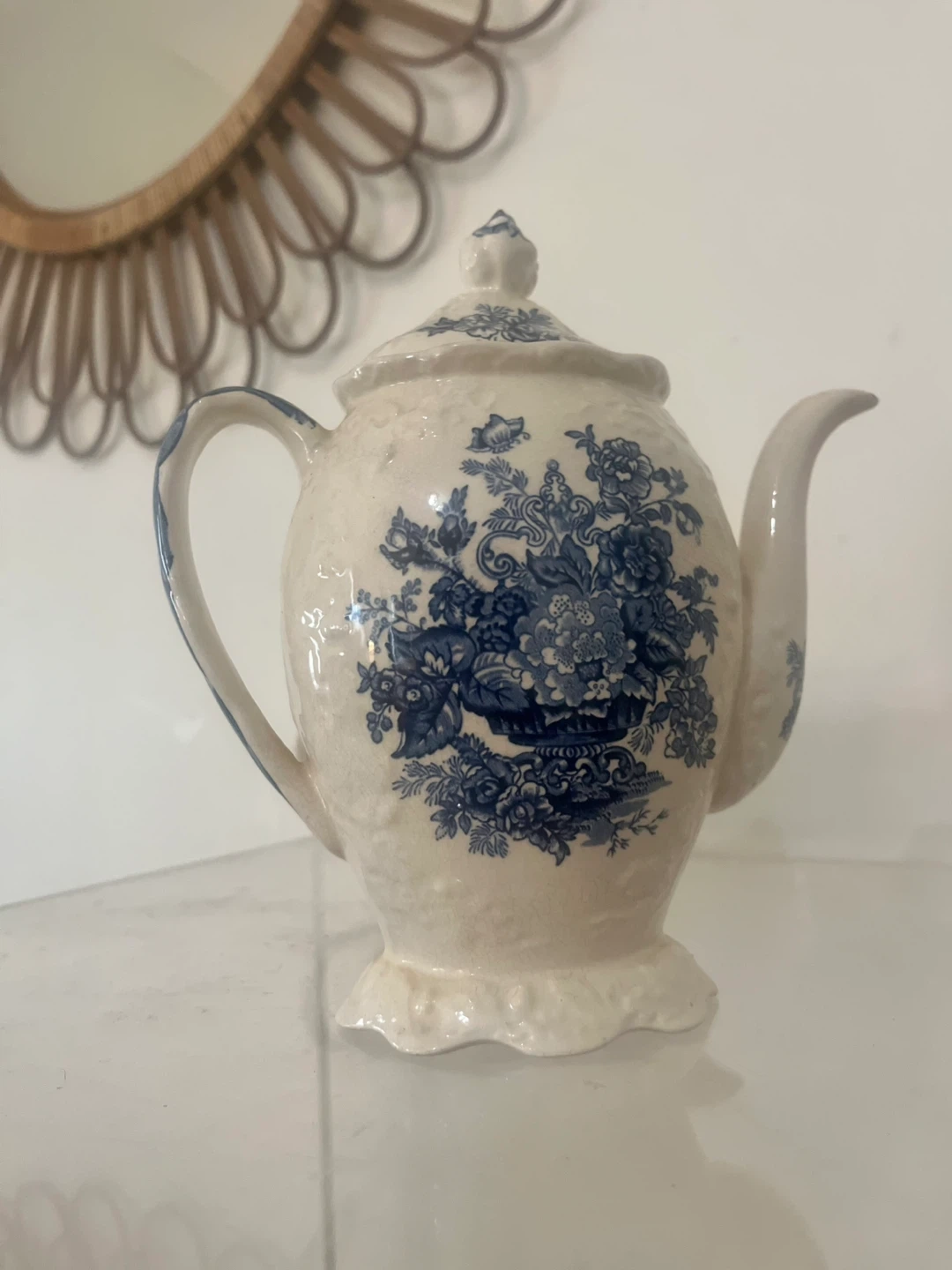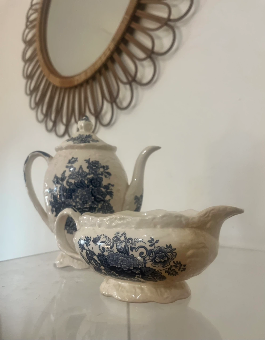 Selling a charming vintage teapot with a matching gravy boat. The set features a beautiful blue floral design on a cream-coloured base. Perfect for adding a touch of elegance to your tea time or dinner gatherings! A lovely addition to any collection or kitchen.