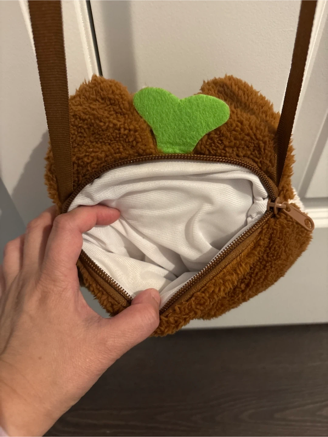 This is a super cute plush dog shoulder bag! It's brown and white with a green leaf detail. Perfect for carrying small items and adding a touch of fun to your outfit