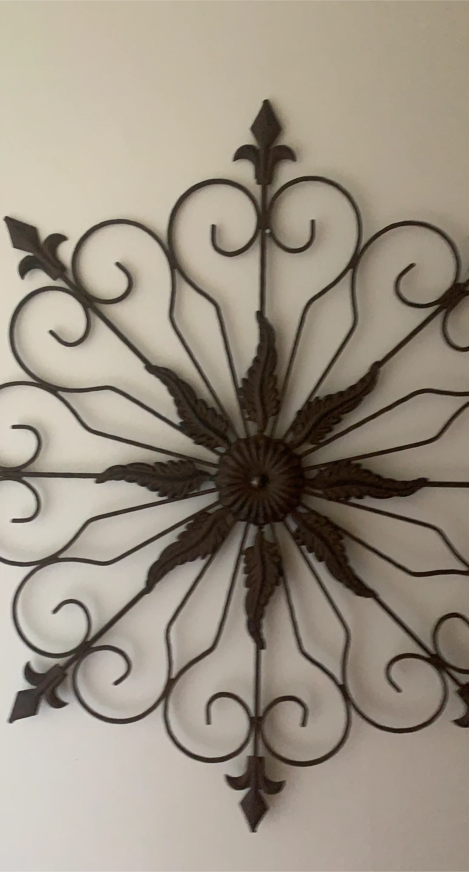 This is a metal sunburst wall decor piece! It's in great condition and would look great in any room. The metal has a dark, rustic finish.