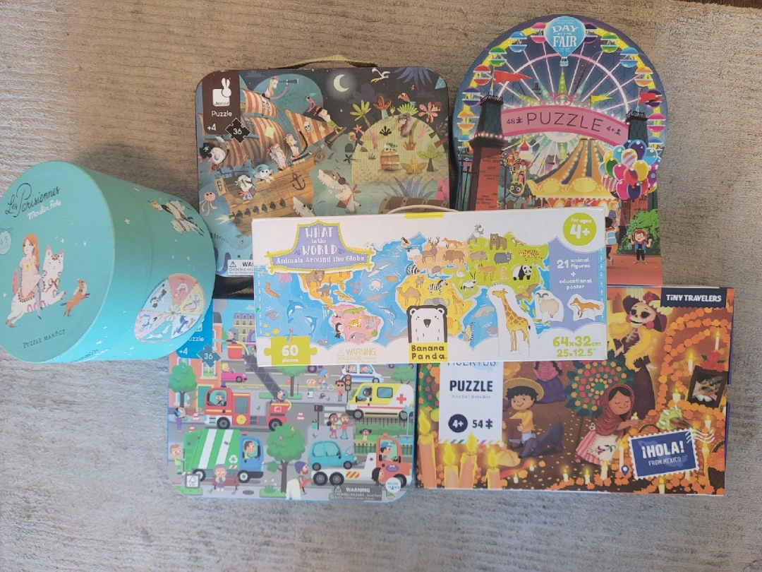Selling a collection of kids' puzzles! There are a few different brands including Crocodile Creek, Janod, and Banana Panda. Each puzzle has a different number of pieces and a unique theme, so there's something for everyone