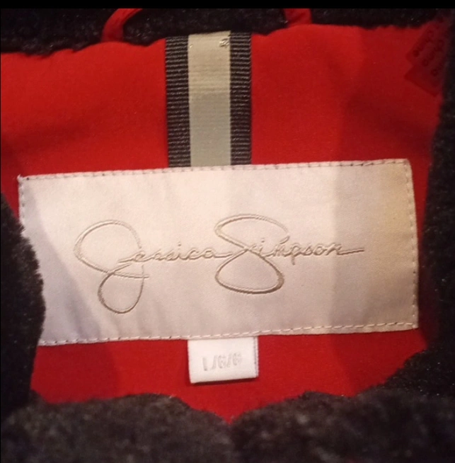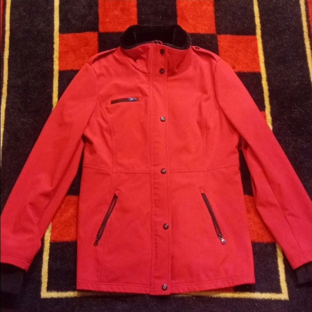 77Selling a Jessica Simpson jacket in red, size large. It features a stylish design with buttons and zipper pockets. Perfect for adding a pop of colour to your wardrobe!