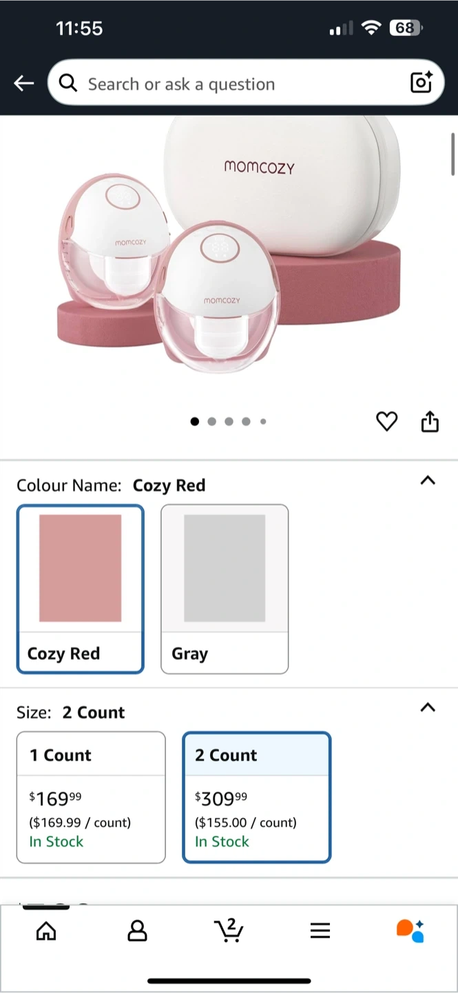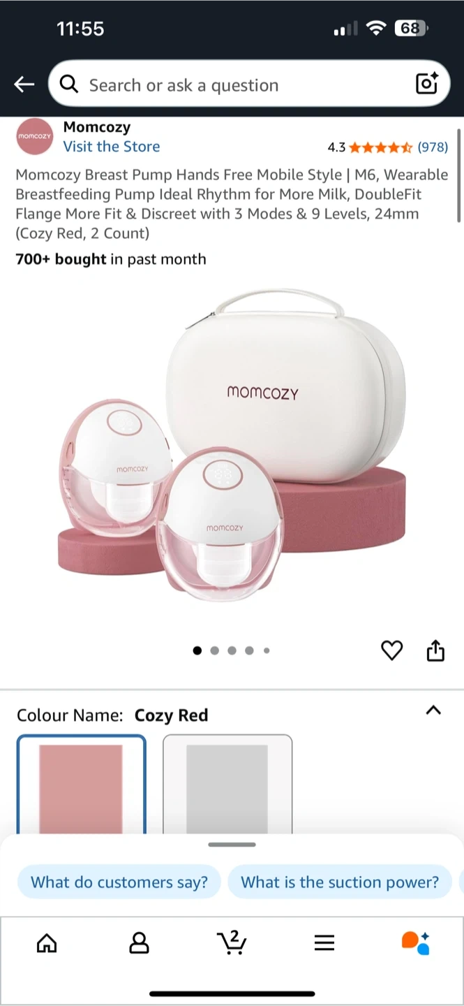 Selling a Momcozy Breast Pump Hands Free Mobile Style M6 in Cozy Red! This wearable breastfeeding pump is designed for more milk, with a DoubleFit Flange for a better fit. It's discreet and has 3 modes and 9 levels. Comes in a 2-count set. New opened box condition. You can turn it on before you purchase to see it works
