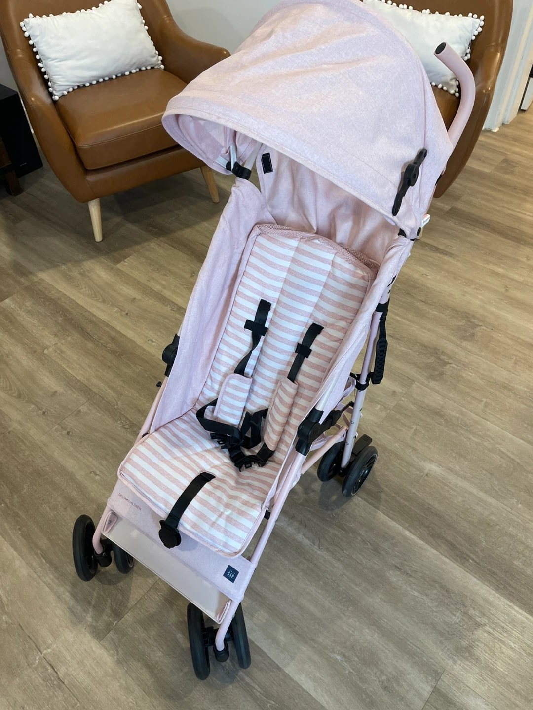 Here's a Delta Children stroller in collaboration with GAP! It's a light pink color with white and pink striped accents. Perfect for walks around the neighborhood or trips to the park