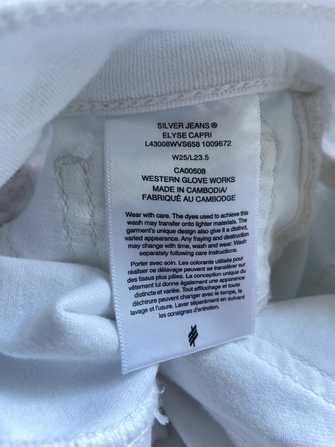Selling a pair of Silver Jeans Elyse Capri in size 25. These are white and made by Western Glove Works in Cambodia. The tag also says L43008WVS658 1009672. Feel free to ask any questions!