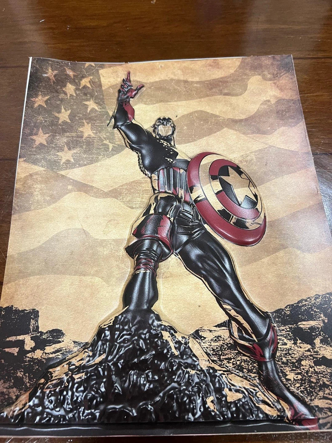 I'm selling a piece of Captain America comic art. It features Captain America standing heroically in front of an American flag. The artwork has a unique embossed or 3D effect, making it stand out!
