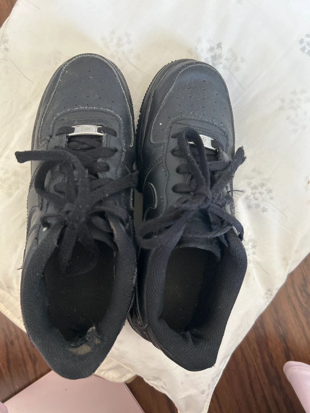 Selling a pair of black Nike Air Force 1 sneakers. They're in used condition, as you can see in the photos, but still have lots of life left! Great for everyday wear or hitting the basketball court