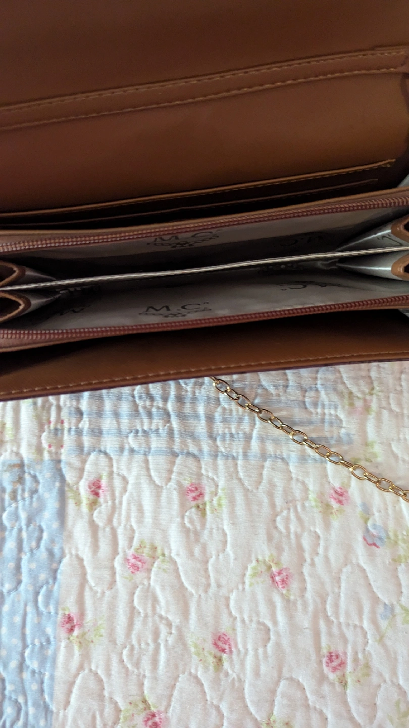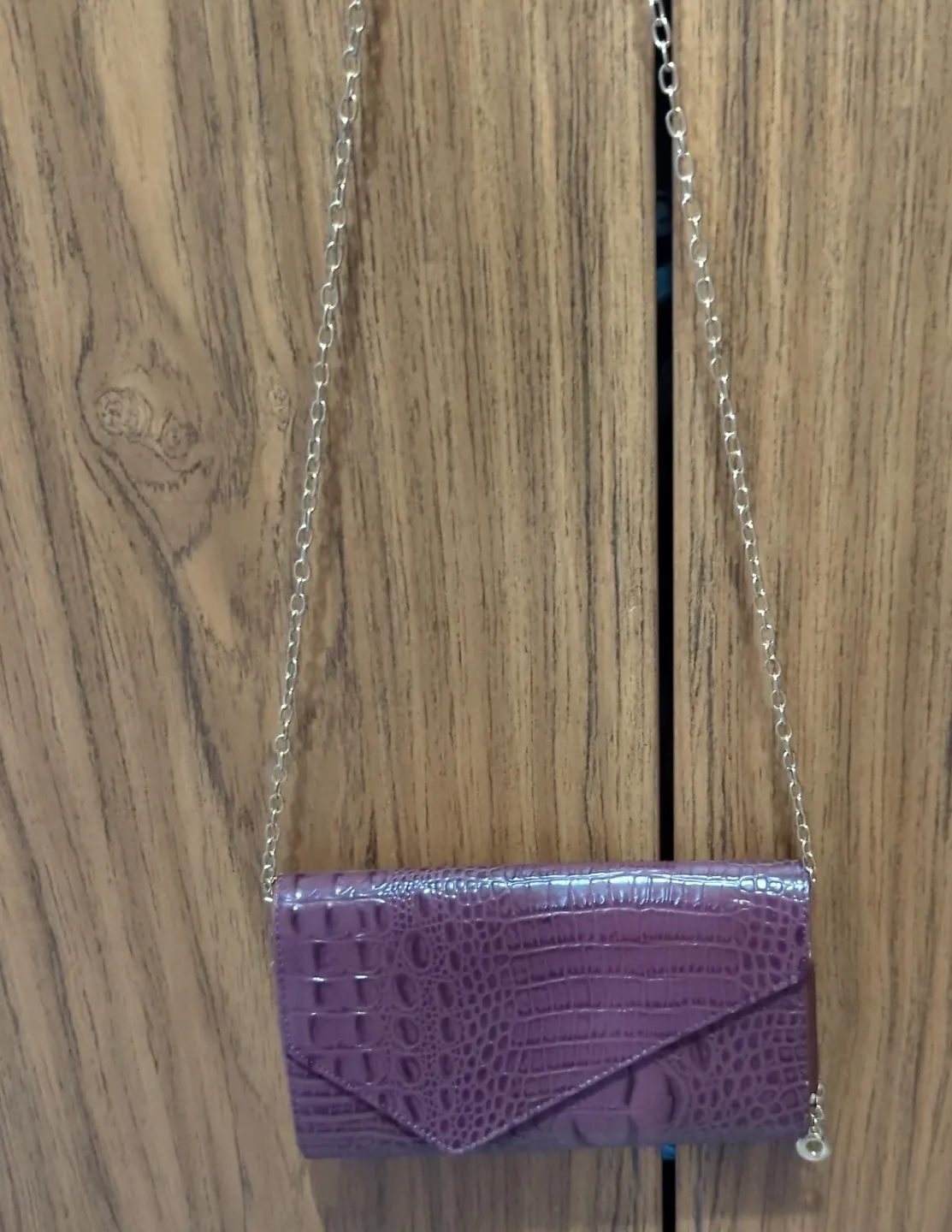 Here's a stylish M.C. wallet with a croc-embossed texture and a chain strap. It's a beautiful purple color and perfect for carrying your essentials in style