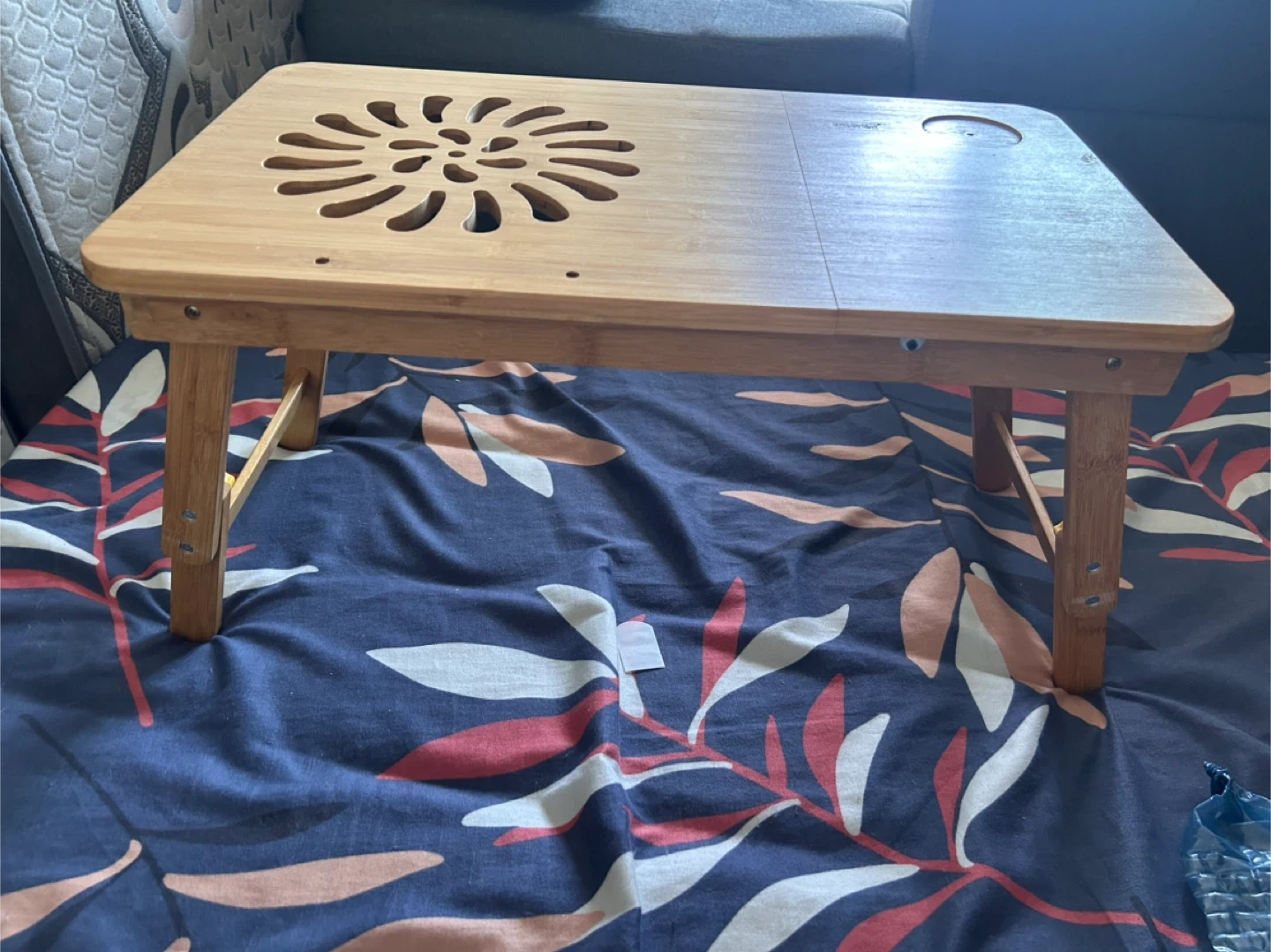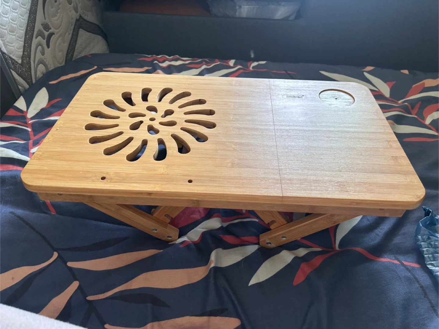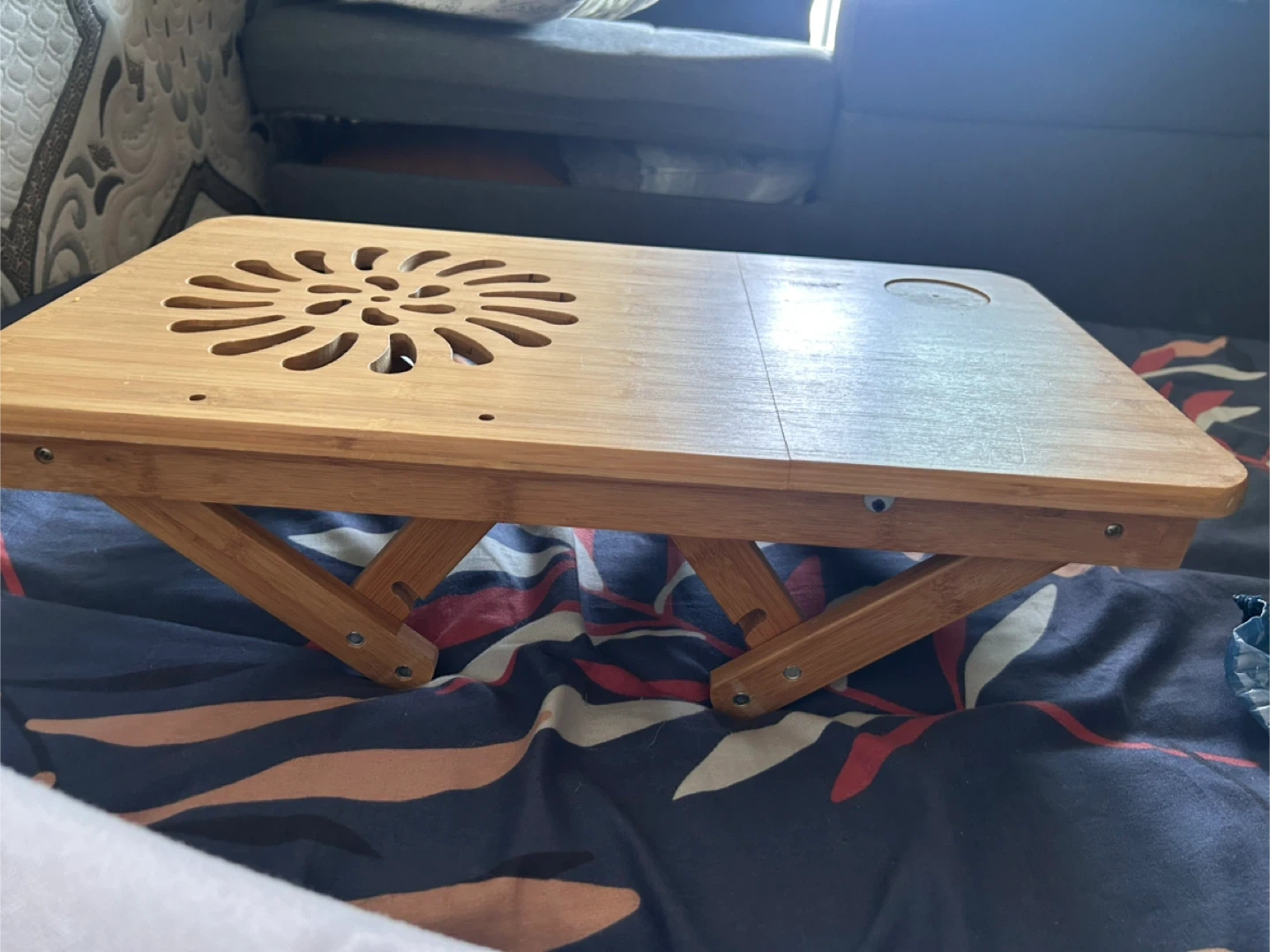 Selling a handy wooden folding laptop desk! It's perfect for using in bed or on the couch. The legs fold in for easy storage and to adjust height. It has a nice design cut out on the top and a little cup holder Pick up near bay and temperance