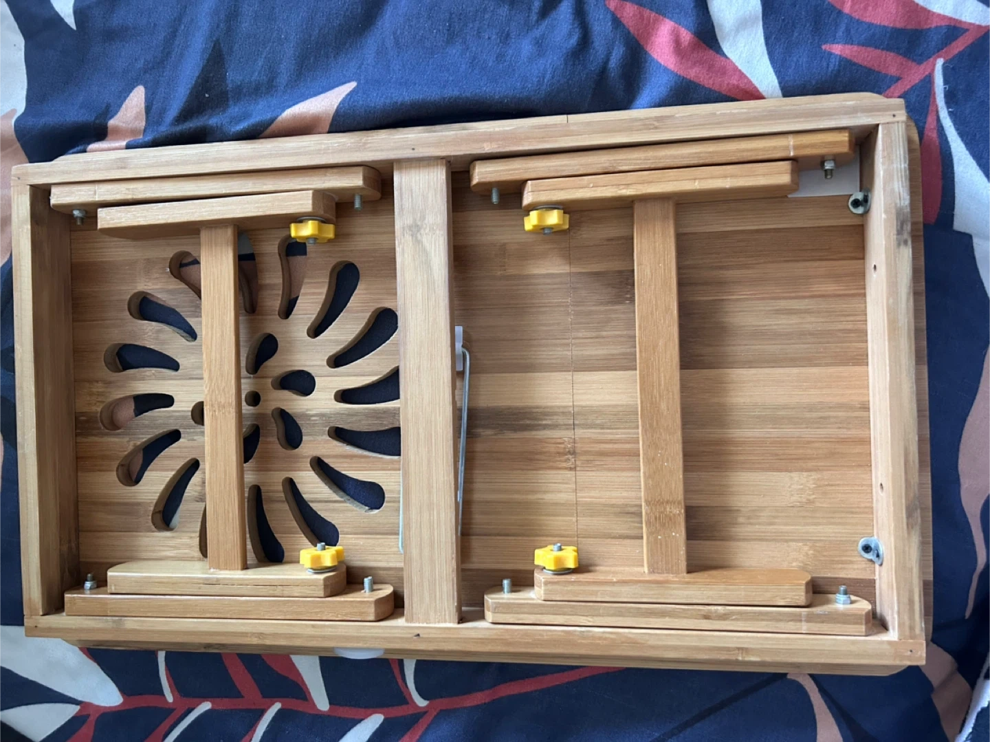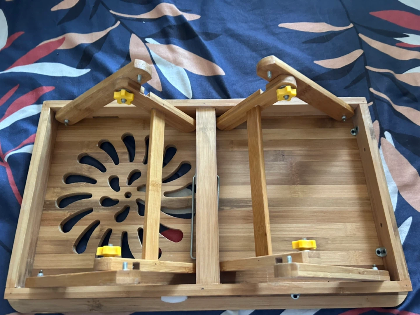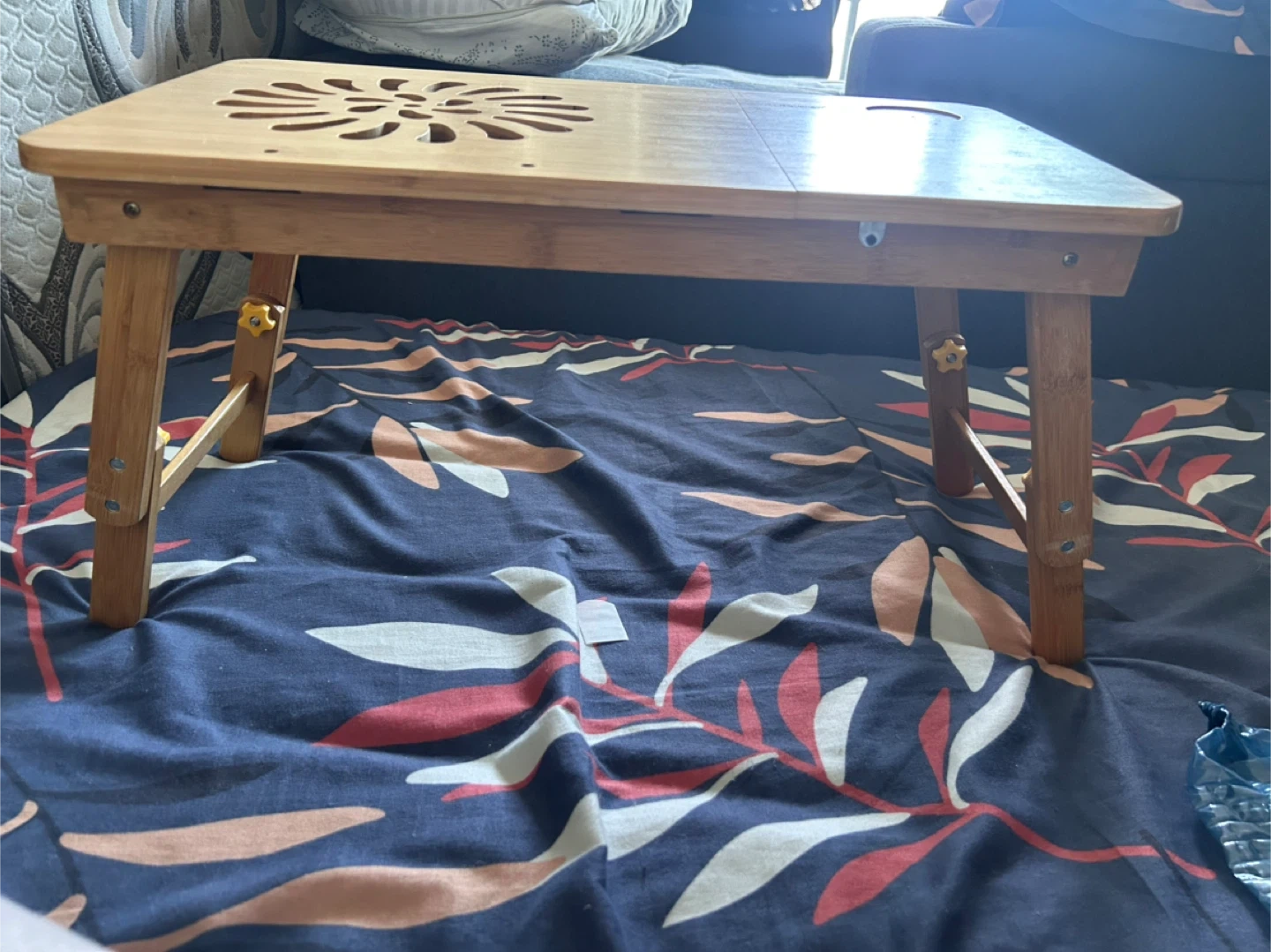 Selling a handy wooden folding laptop desk! It's perfect for using in bed or on the couch. The legs fold in for easy storage and to adjust height. It has a nice design cut out on the top and a little cup holder Pick up near bay and temperance