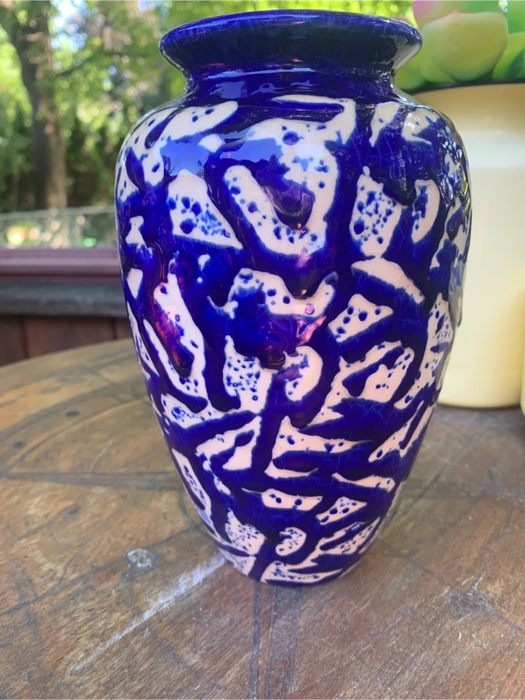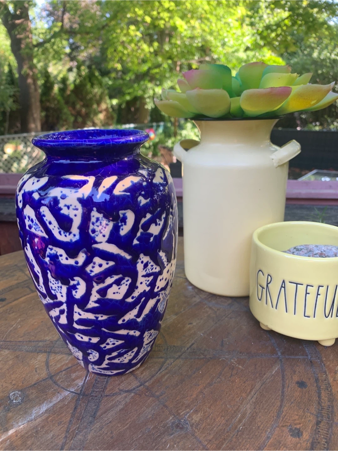 Selling a beautiful blue and white patterned ceramic vase. It has a lovely shape to it and the pattern is slightly raised. There is some light crazing but I think it adds to the vase. The blue is a deep indigo colour and reminds me of the blue and white of Greece! This vase would look stunning on its own styled on a bookshelf or a dresser but would be equally lovely styled with fresh flowers! It's in great condition and would look lovely in any home! 💙