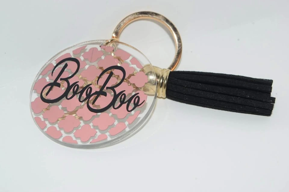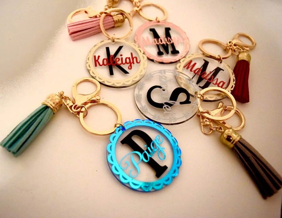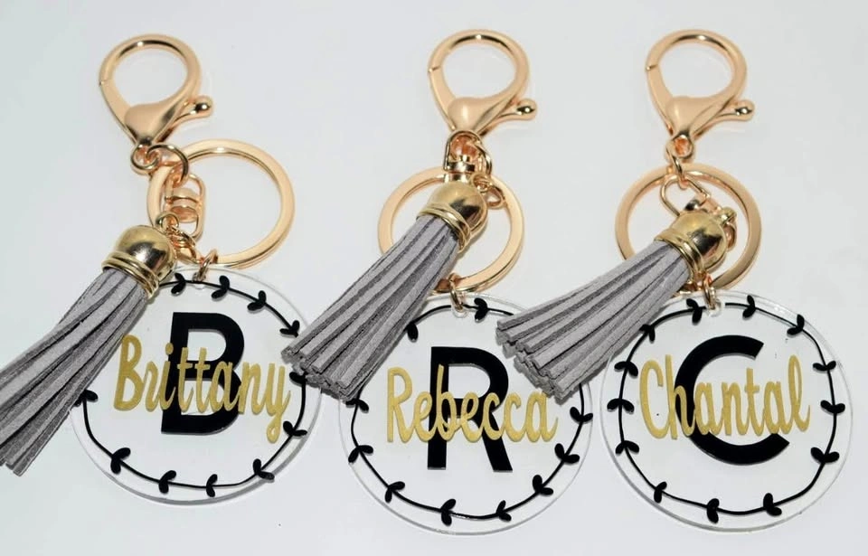 Bulk personalized acrylic keychains for party favors, gifts or events. Custom name or monogram design with tassel. Discounts available!