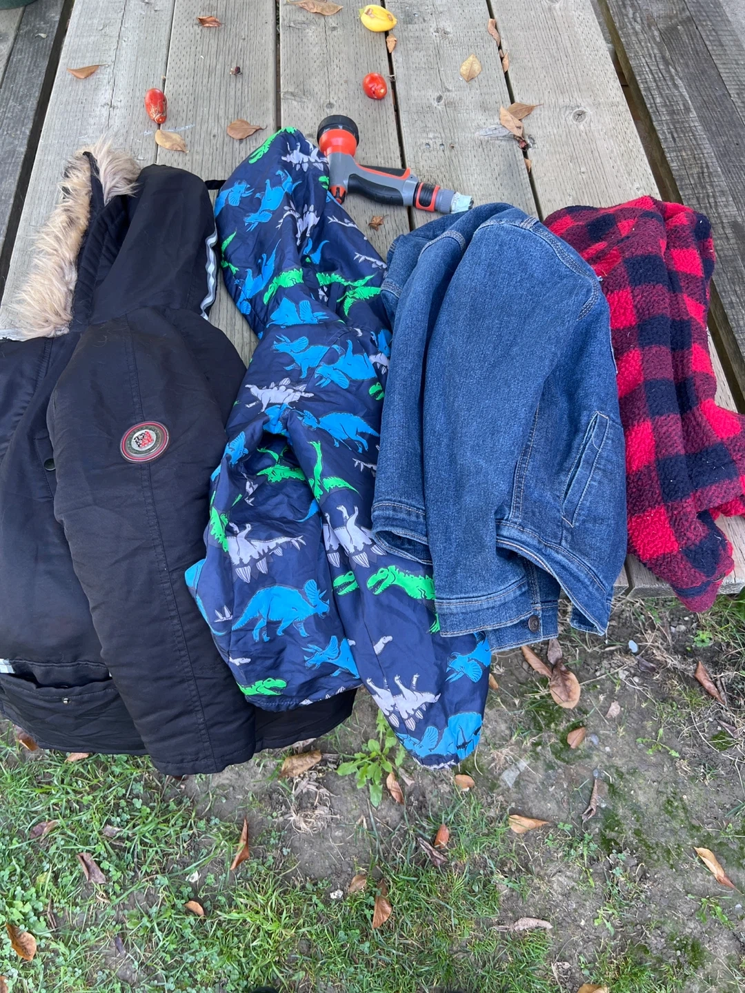 Selling a mixed bundle of kids' clothing. Includes a black winter jacket with a fur-trimmed hood, a blue dinosaur-print jacket, a denim jacket, and a red and black plaid fleece jacket. All in good condition!