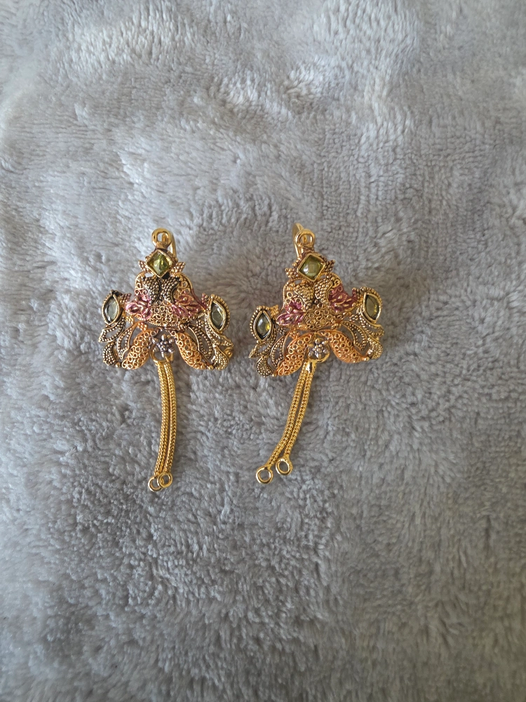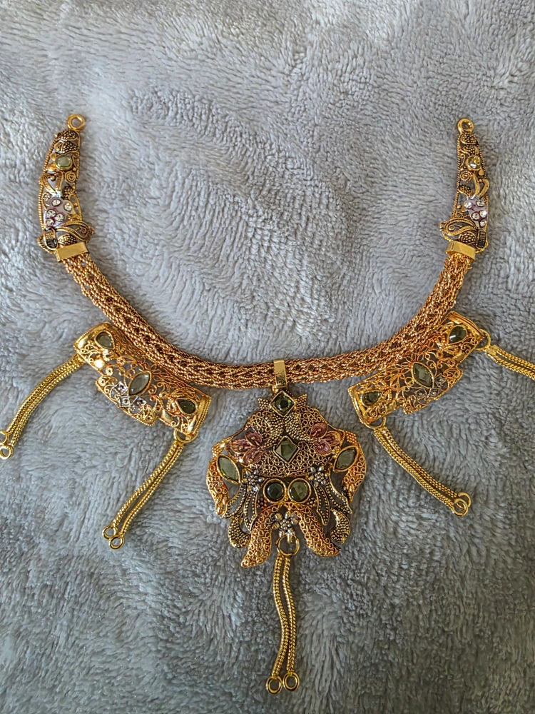 Selling a beautiful gold-tone necklace and earring set. The necklace features an intricate design with green and pink accents. The matching earrings complement the necklace perfectly. Great for adding a touch of elegance to any outfit!