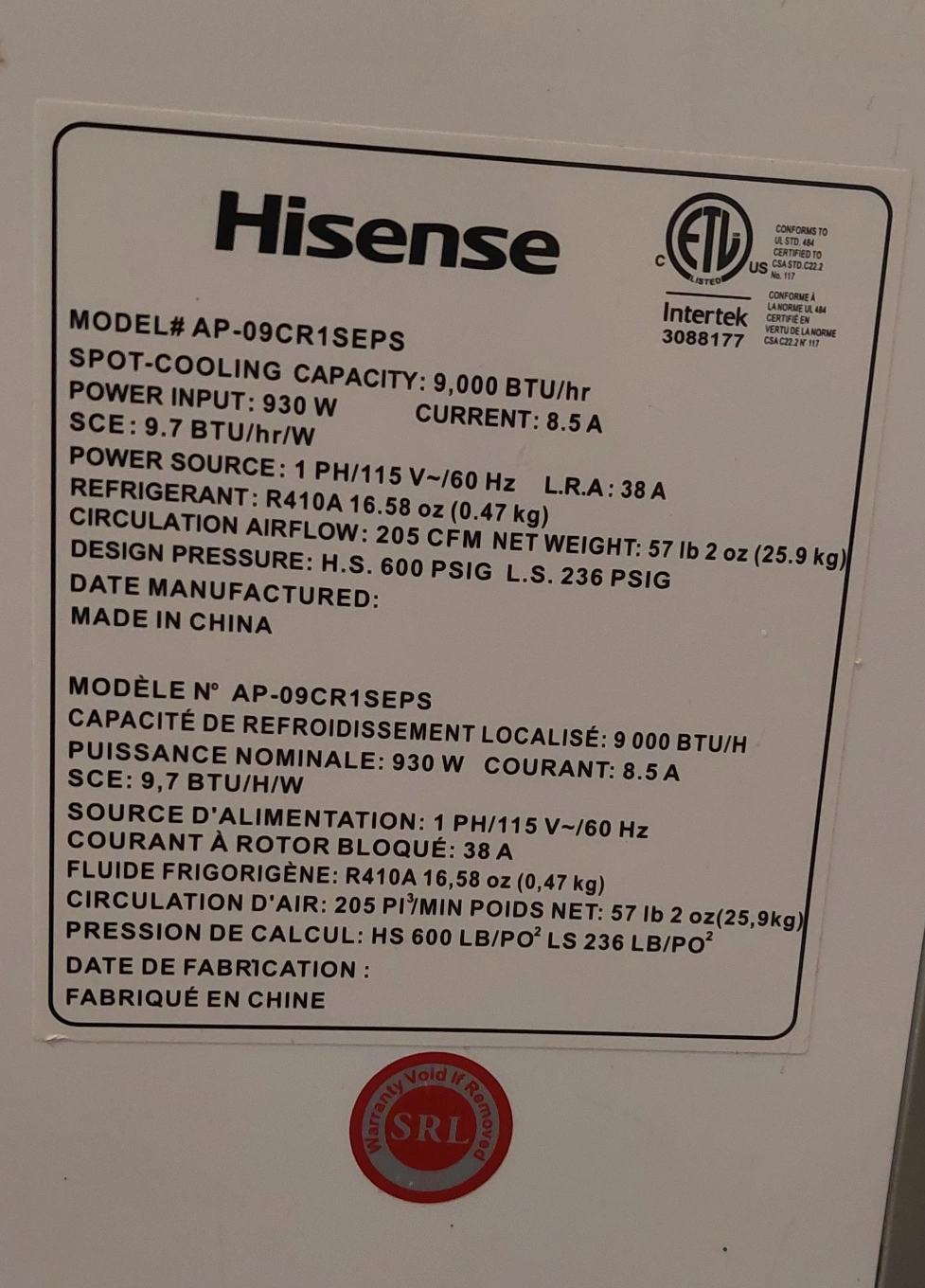 586Selling a Hisense portable air conditioner, model number AP-09CR1SEPS. It has a spot-cooling capacity of 9,000 BTU/hr. Comes with ducting.