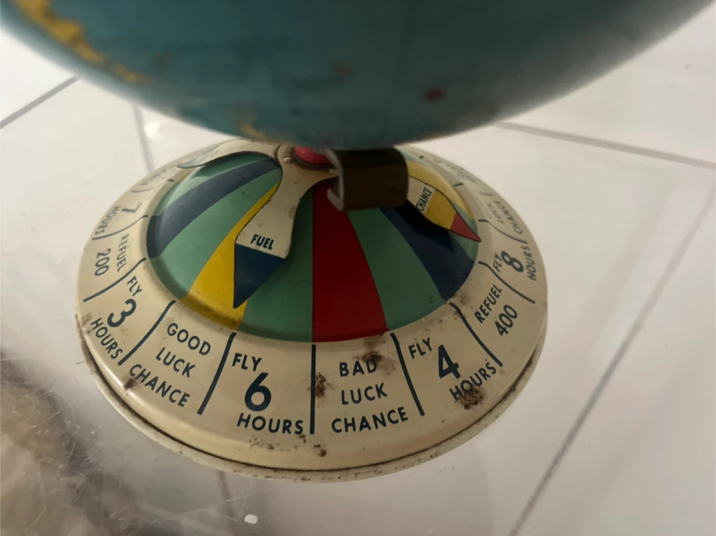 Selling a vintage metal globe! It features a colourful base with a luck indicator, showing "Good Luck Chance" and "Bad Luck Chance" depending on the hours. The globe itself shows countries and continents. A unique piece for any collector!