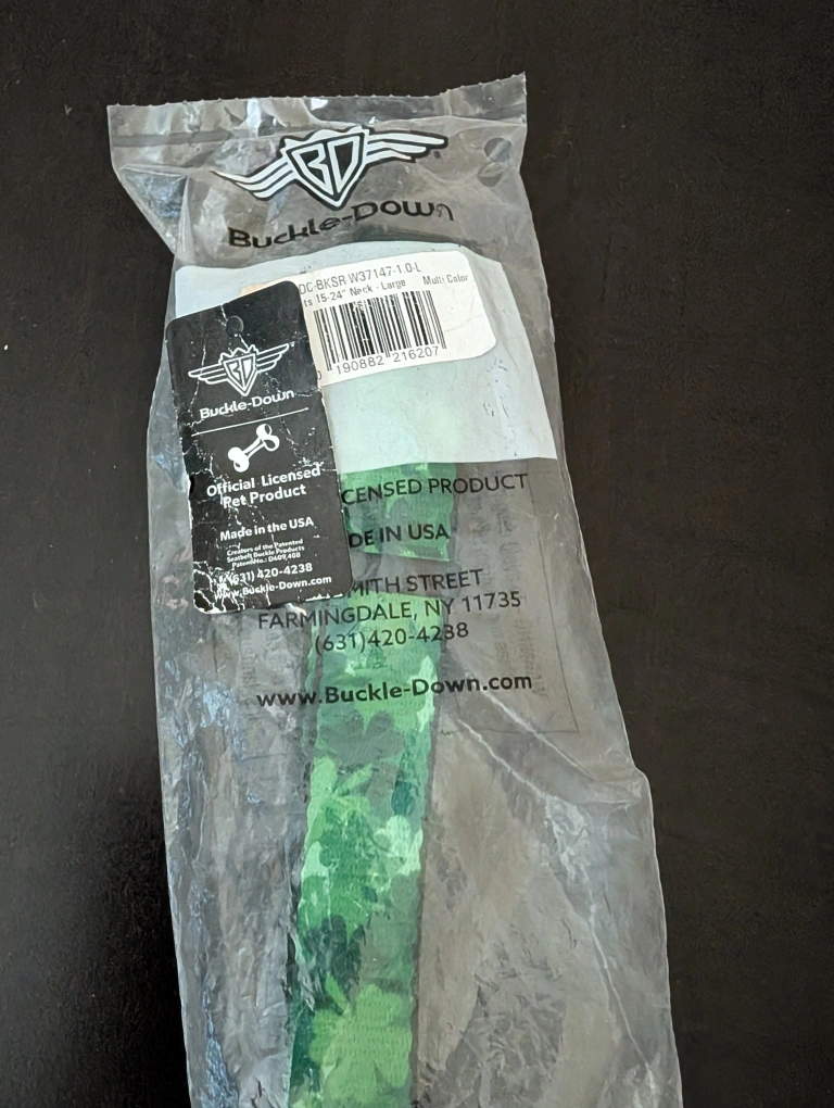 Keep your furry friend looking stylish with this Buckle-Down dog collar! It's a size large, designed to fit necks between 15 and 24 inches. The collar features a fun shamrock pattern in multiple colours. It is 1" wide.