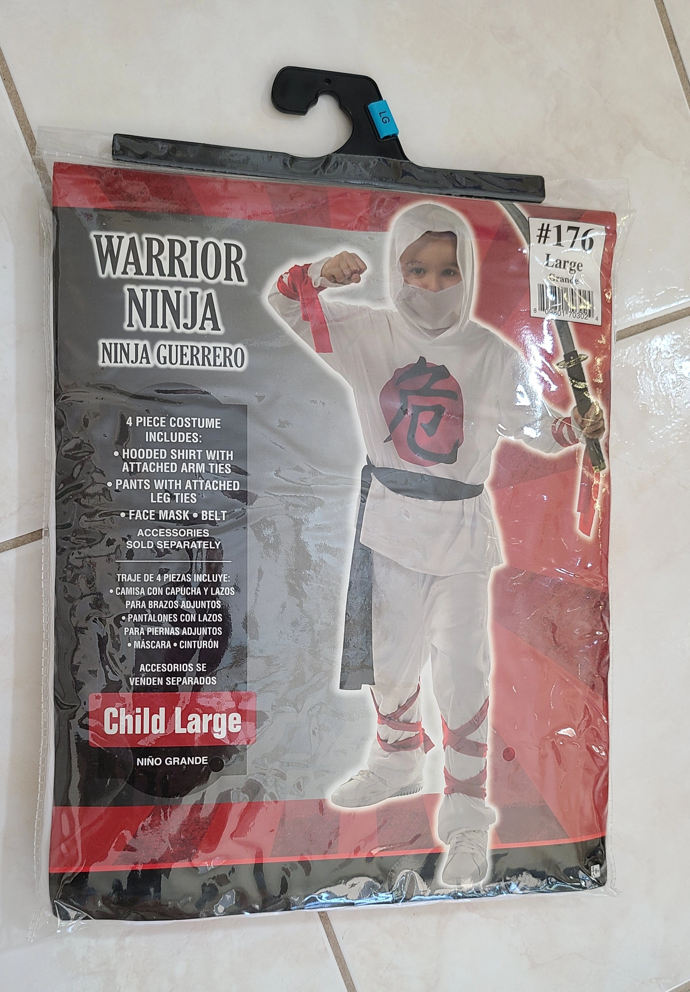 Worn once. Washed and is ready to be worn. For 12-14 year old. Height 152cm. 4 piece costume - includes hooded shirt with attached arm ties, pants with attached leg ties, face mask and belt. Pickup Hilda and Clark Ave, Thornhill.