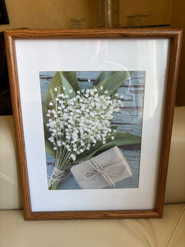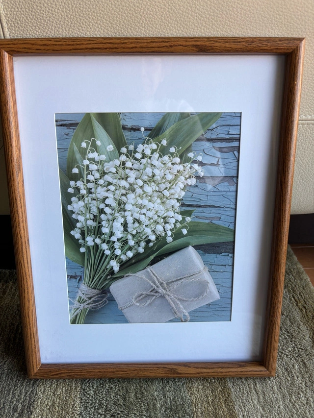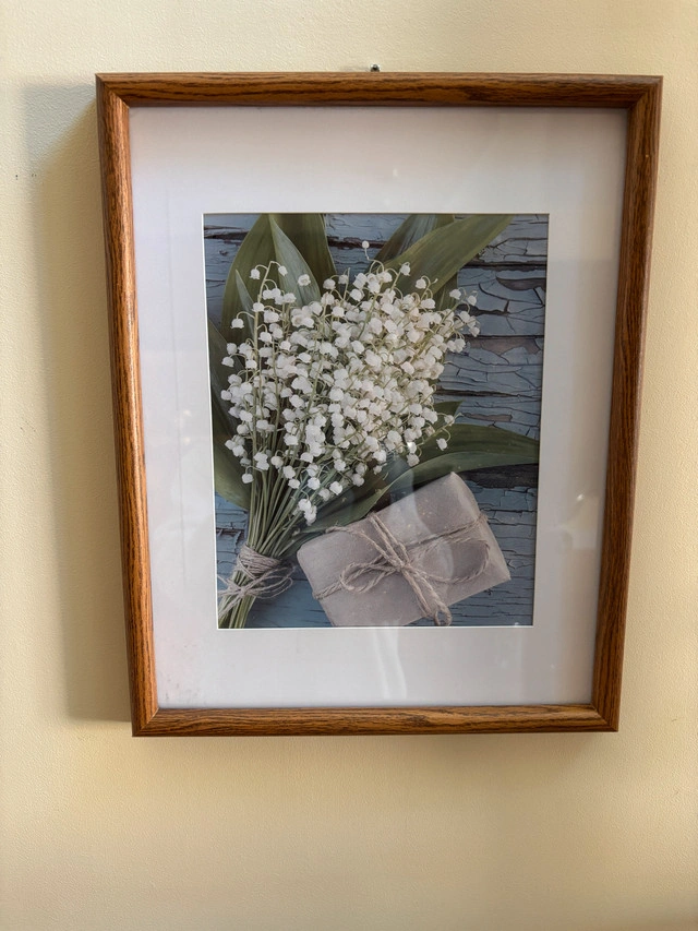 This framed lily of the valley print adds a touch of nature to any space. This piece features a bouquet of lily of the valley flowers against a distressed wood background, encased in a simple wood frame. It's in good condition, ready to hang and bring a serene vibe to your home.