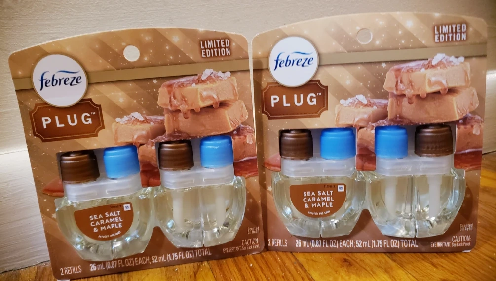 Febreze Plug refills in the limited edition Sea Salt Caramel & Maple scent! Each pack contains 2 refills, with each refill holding 26 mL (0.87 FL OZ), totaling 52 mL (1.75 FL OZ) per pack