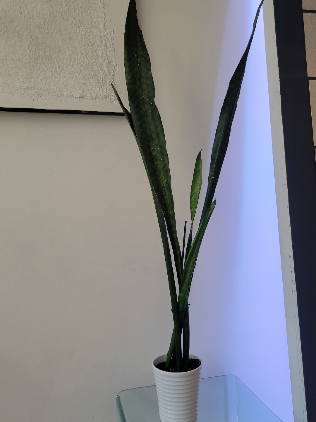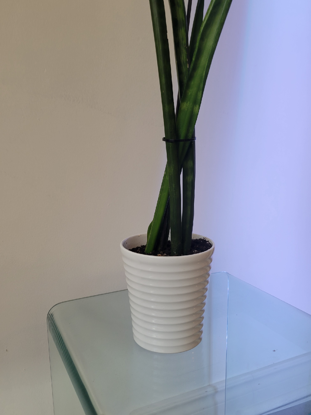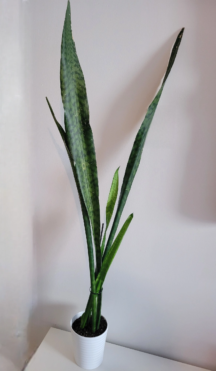 Selling a healthy snake plant in white pot. It's a great low-maintenance plant that's perfect for adding a touch of greenery to your home. Easy to care for and can thrive in various lighting conditions