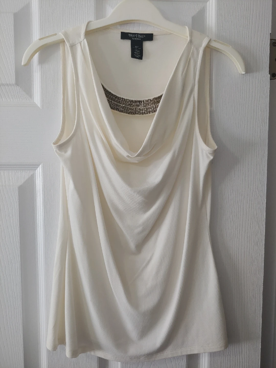 A lovely sleeveless top from White House Black Market! It's a creamy white colour with a beaded neckline. This necklace piece is removable! worn once. it is very clean no stains or tears.