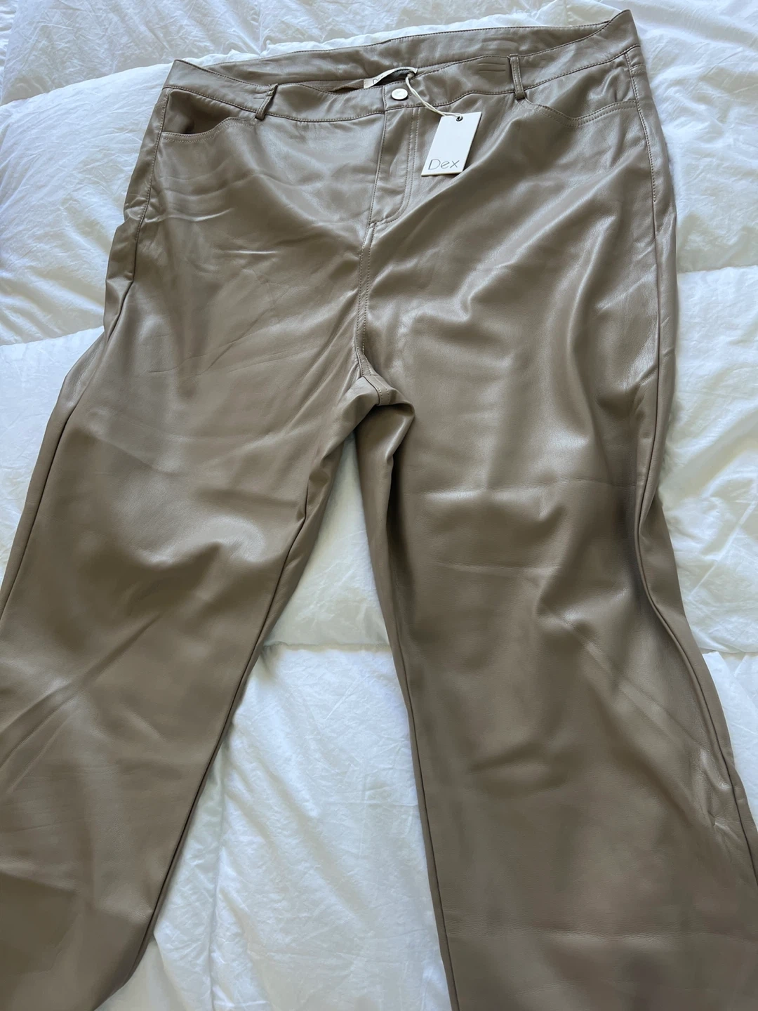 77These are a pair of Dex faux leather pants, size 2X. They're brand new with tags still attached! The colour is a neutral beige. They have a classic cut and are ready for a new home