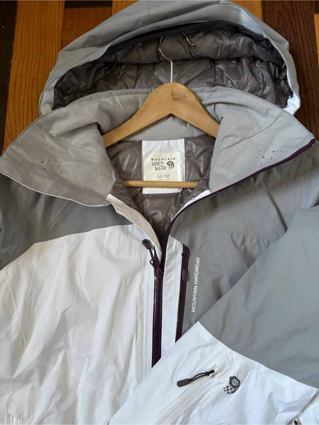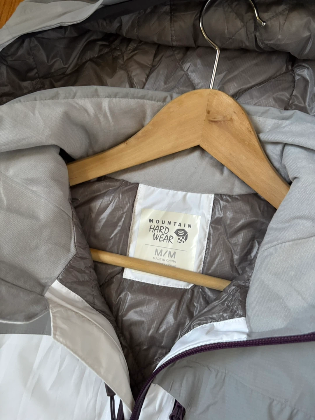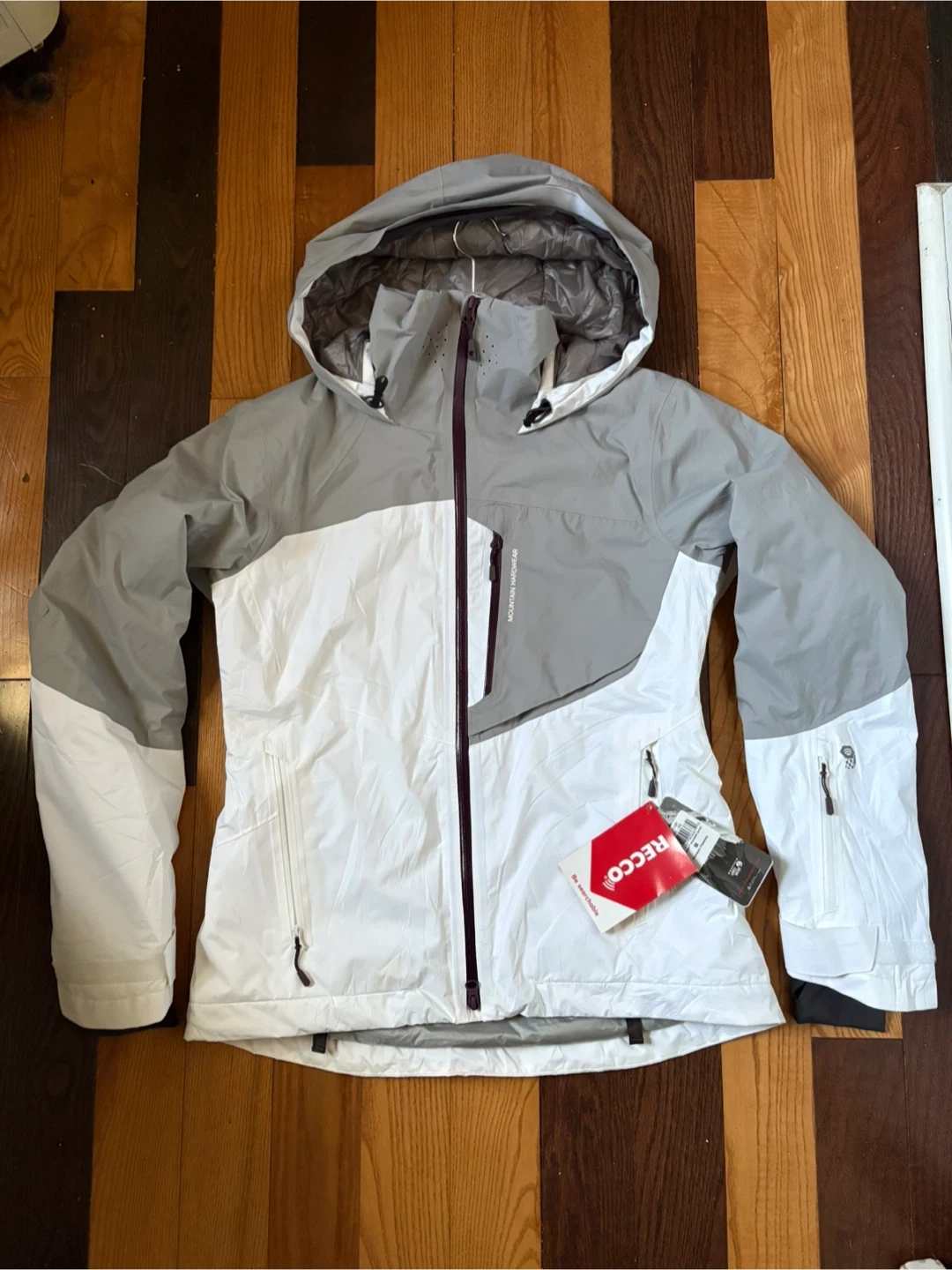 Selling a Mountain Hardwear ski jacket in size medium. It's a stylish grey and white colour. Perfect for hitting the slopes or just staying warm this winter! Two minor marks on the back hard to see- aside from that no flaws brand new with tags